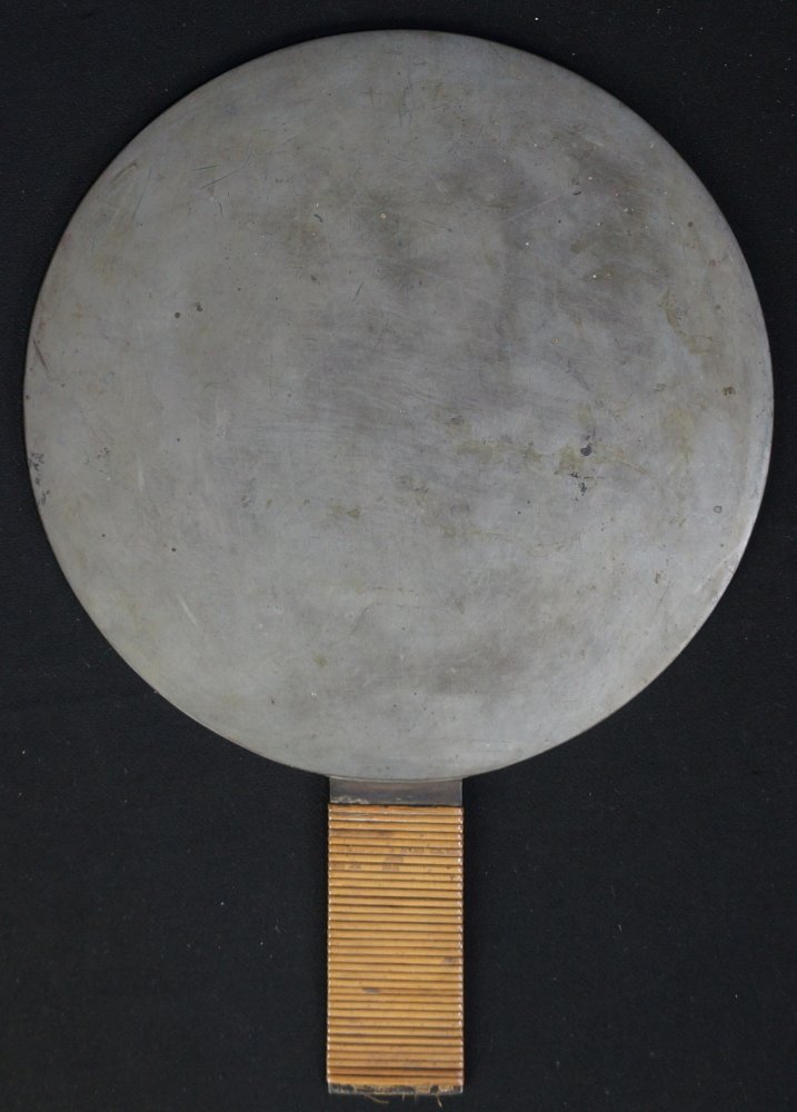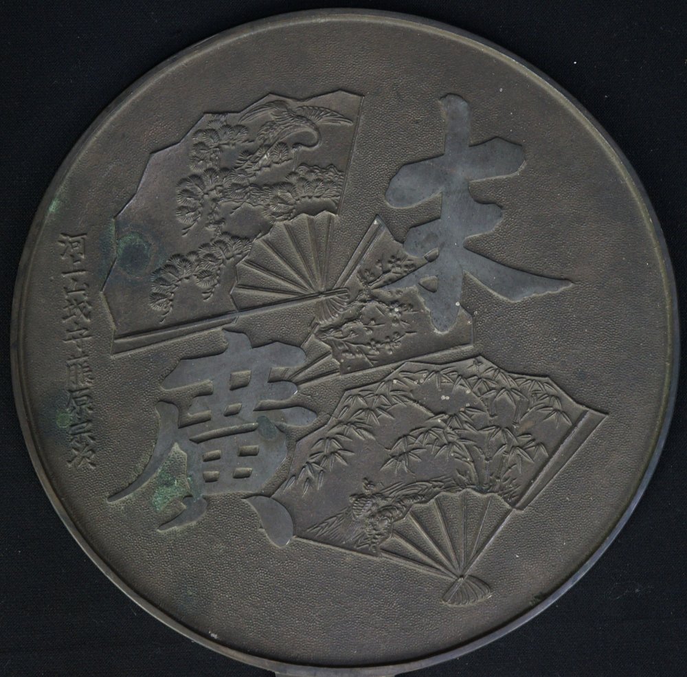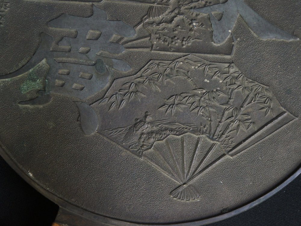 Nice antique Japanese mirror decorated with Sensu fans, Matsu, Sakura, bamboo motif. Nice patina  good  conditions, some wear from time and long usage, no longer reflecting. Nice historical item.
