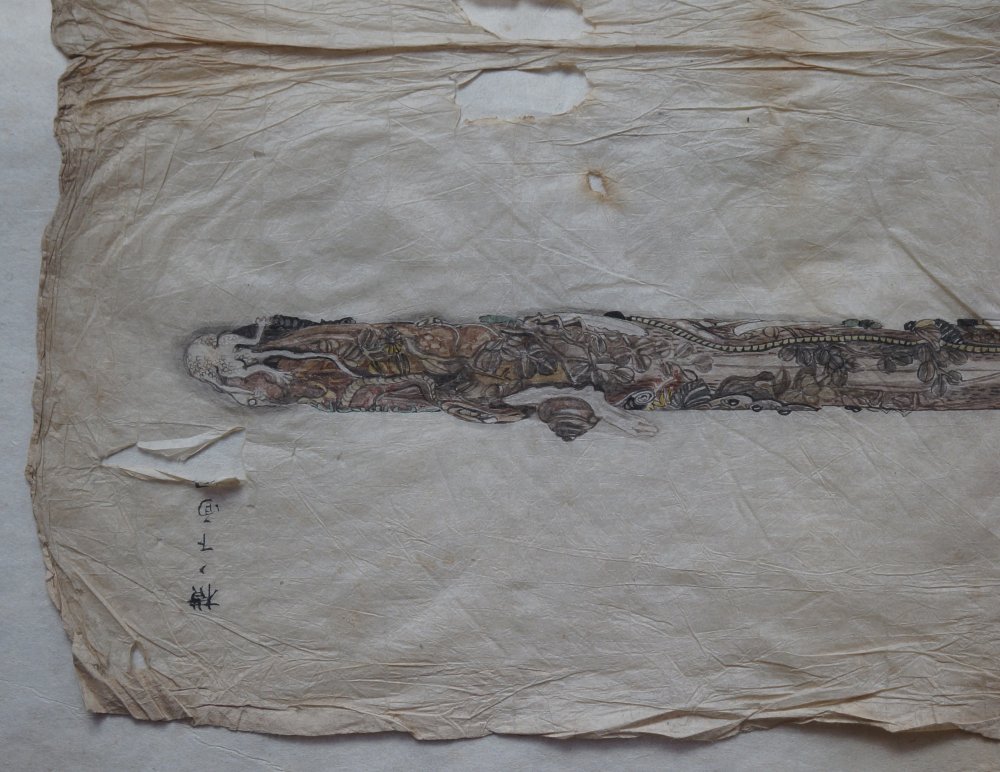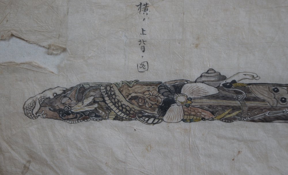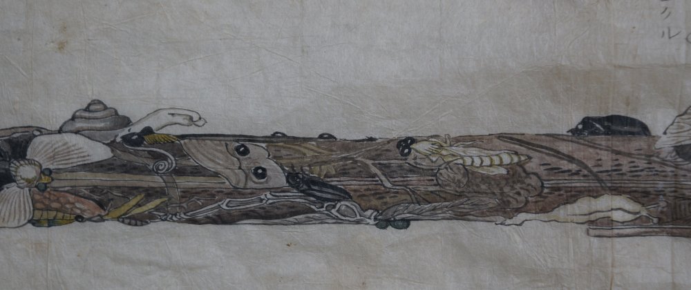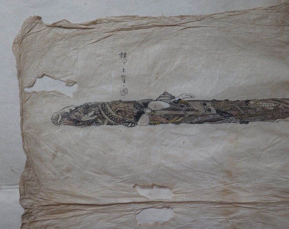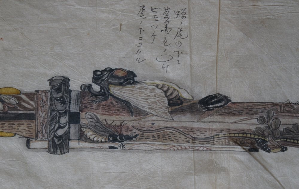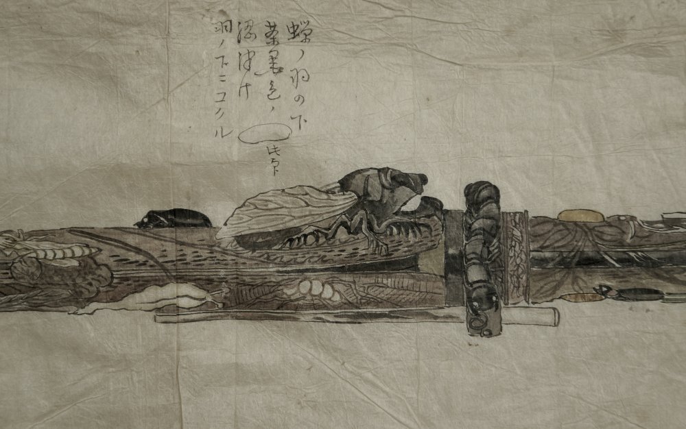 Antique Japanese watercolor painting of Tanto, highly decorated Katana handle and Saya, painted on washi paper Sumi-e ink and watercolor technique. Eccentric naturalistic representation of insects and foliage: forest creatures (森の物). Designed for wood carpenter intended to be carved out of hard woods.