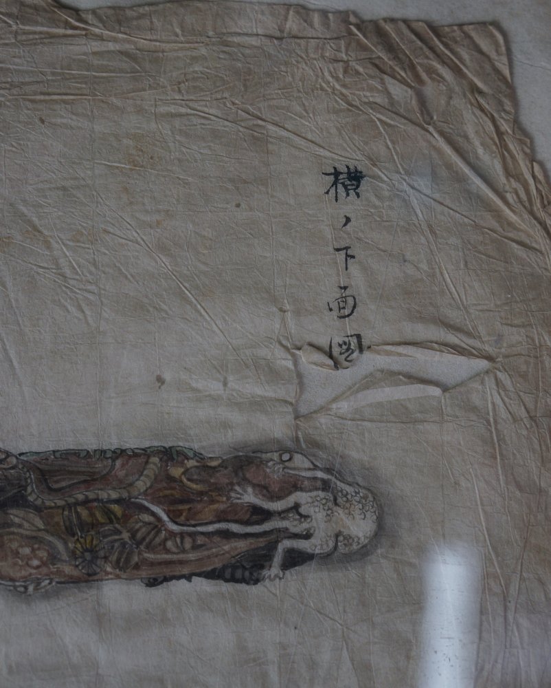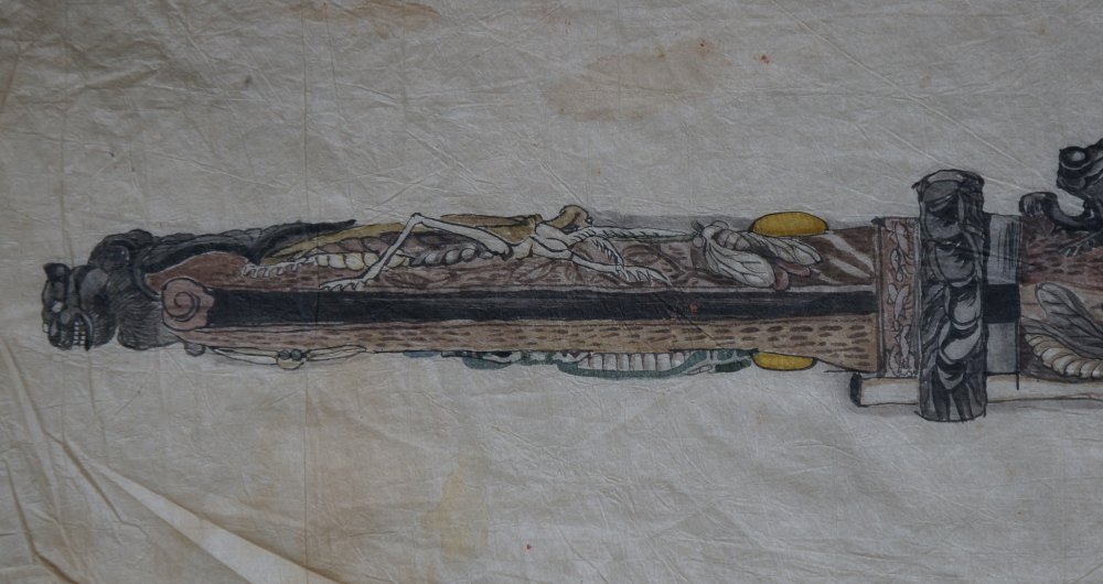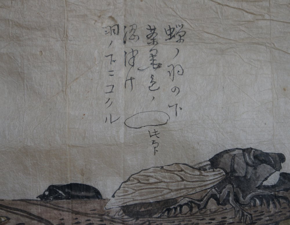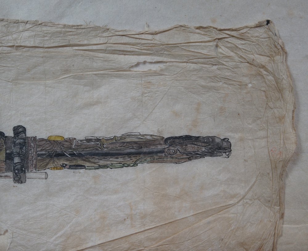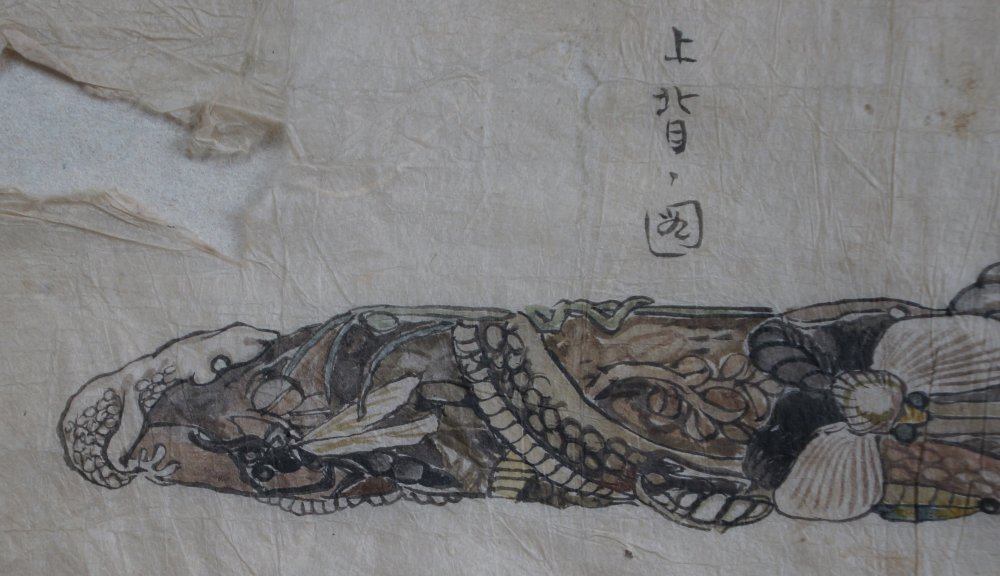 Antique Japanese watercolor painting of Tanto, highly decorated Katana handle and Saya, painted on washi paper Sumi-e ink and watercolor technique. Eccentric naturalistic representation of insects and foliage: forest creatures (森の物). Designed for wood carpenter intended to be carved out of hard woods.