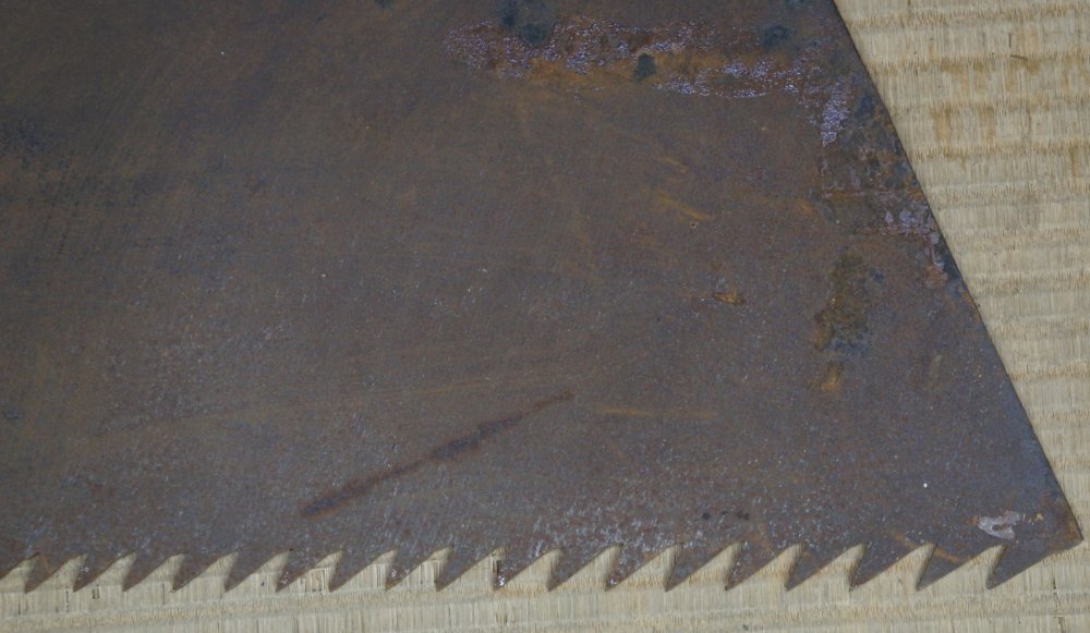 Antique Japanese saw whaleback Meabiki Nokogiri tool hand forged and hammered, makers markings on one side by handle, wear on handle from long usage. Medium good conditions, wear from long use.