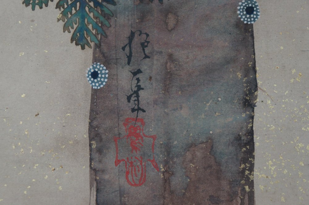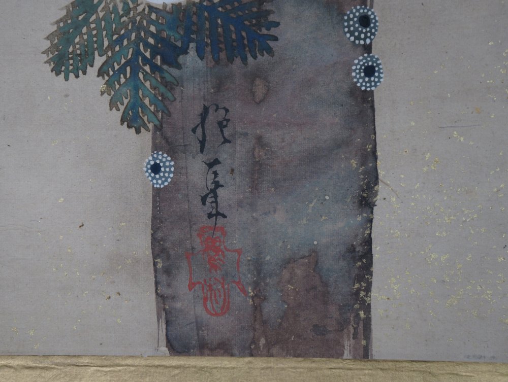 Antique Japanese Matsu tree with snow, watercolor painting on paper, gold leaf borders, once decorating a sliding panel. Signed and sealed by Tomochi Haya (侶チ早). Good conditions, light wear from time and usage. Immediately usable in its original condition.
