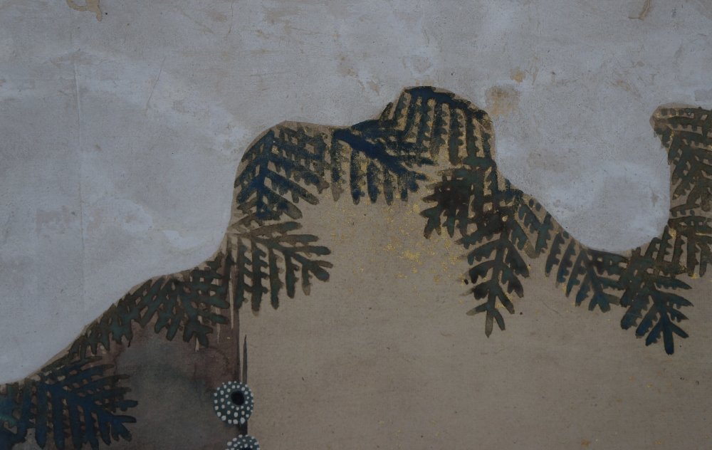 Antique Minimalist Japanese snow Matsu tree watercolor gold leaf 1880