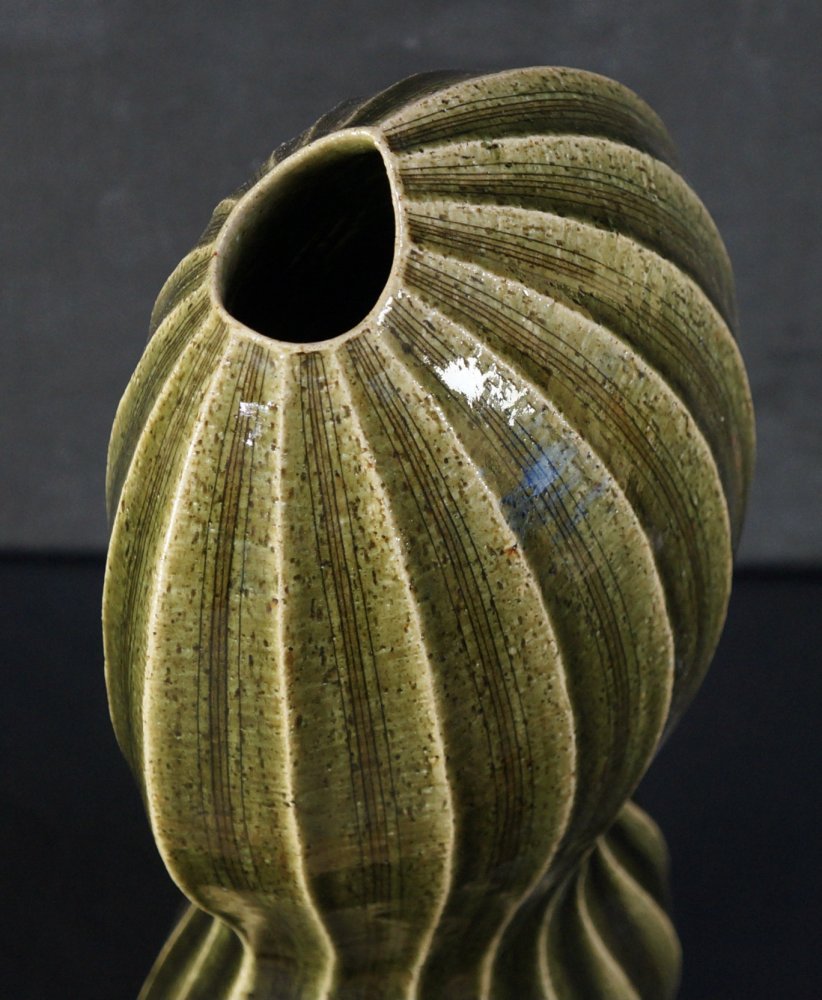 Minimalist Japan Oribe ceramic vase 1960s master wood kiln craft.