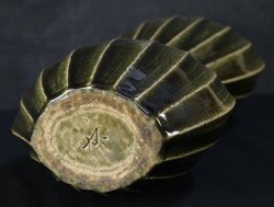 Minimalist Japanese ceramic vase, fine Oribe ceramic glazing, Eda-Mame shape, wood kiln art, signed on bottom by Ka (か). Very good conditions, no fractures, no wear. Immediately usable.