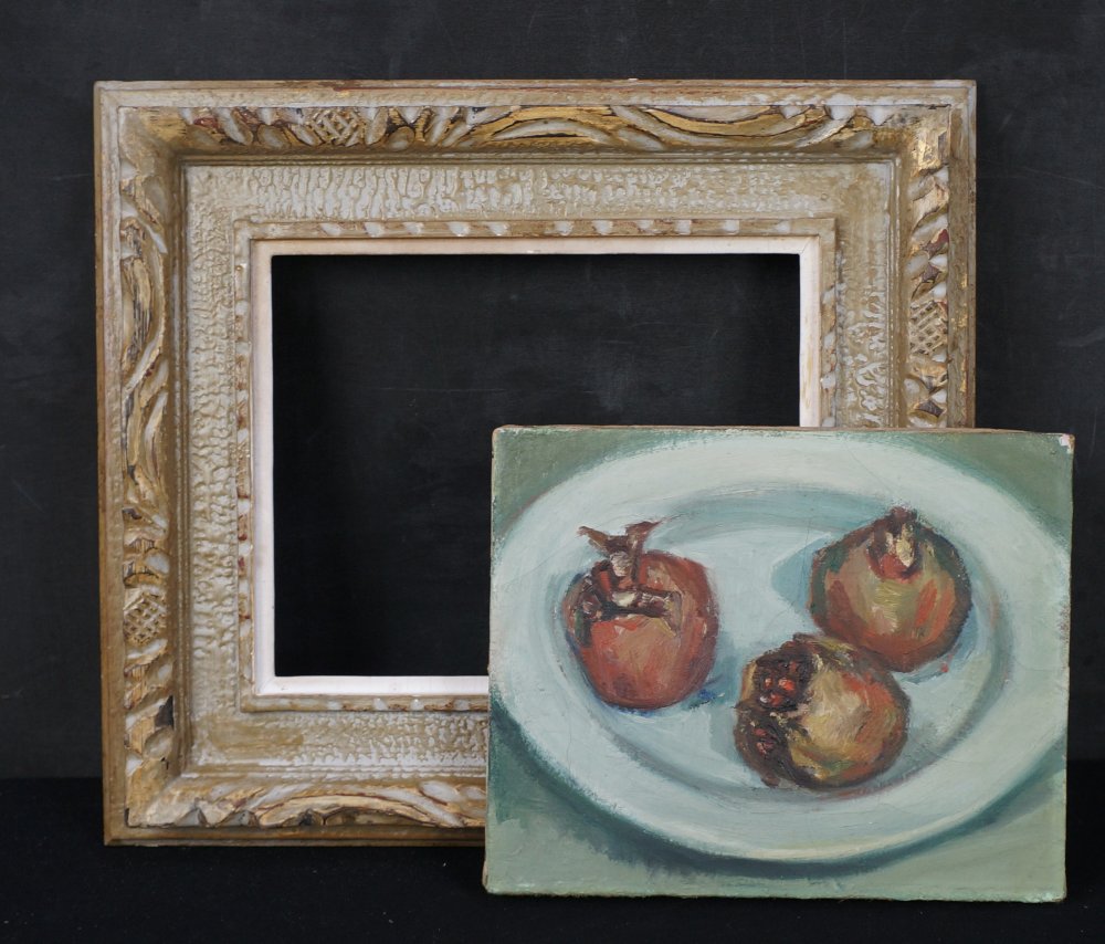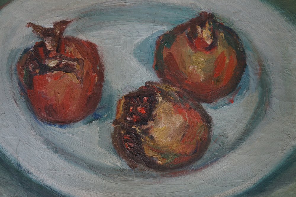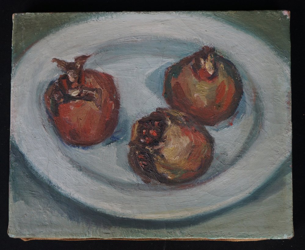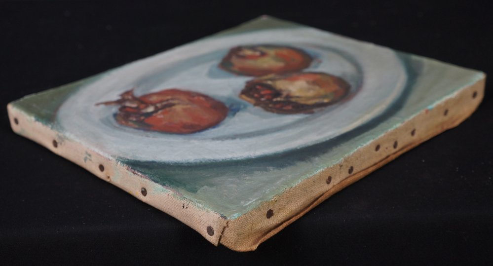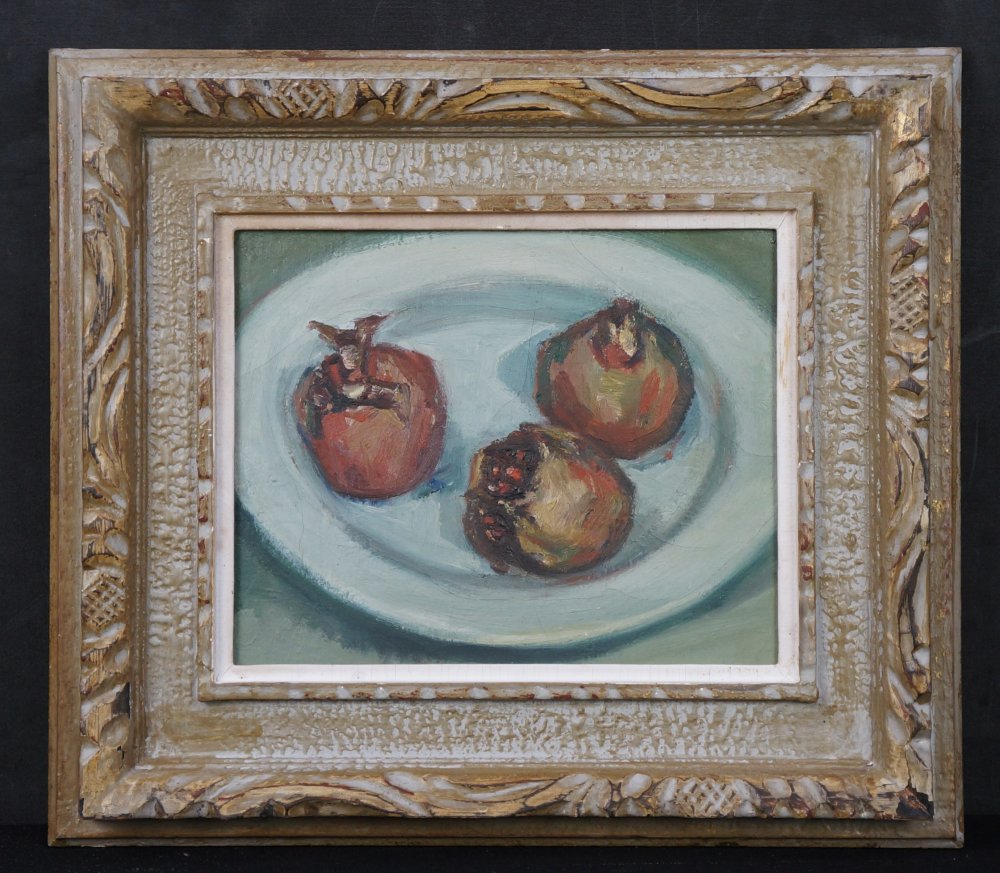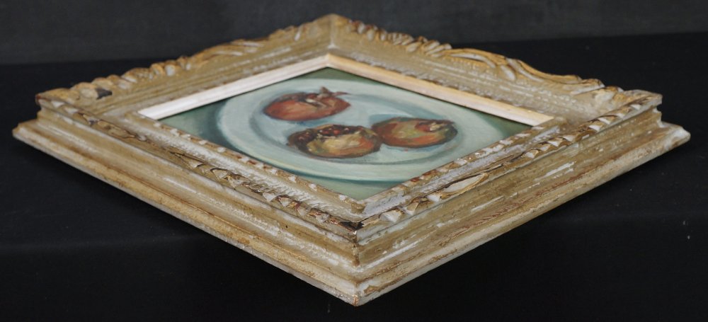 Japanese minimalist still nature oil painting on canvas technique. Nice Minimal depiction of pomegranate, no sign, nice style. Wood  frame. Good conditions, some wear from time and handling.