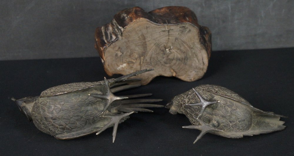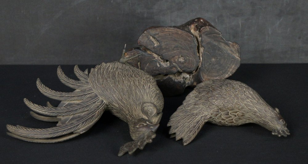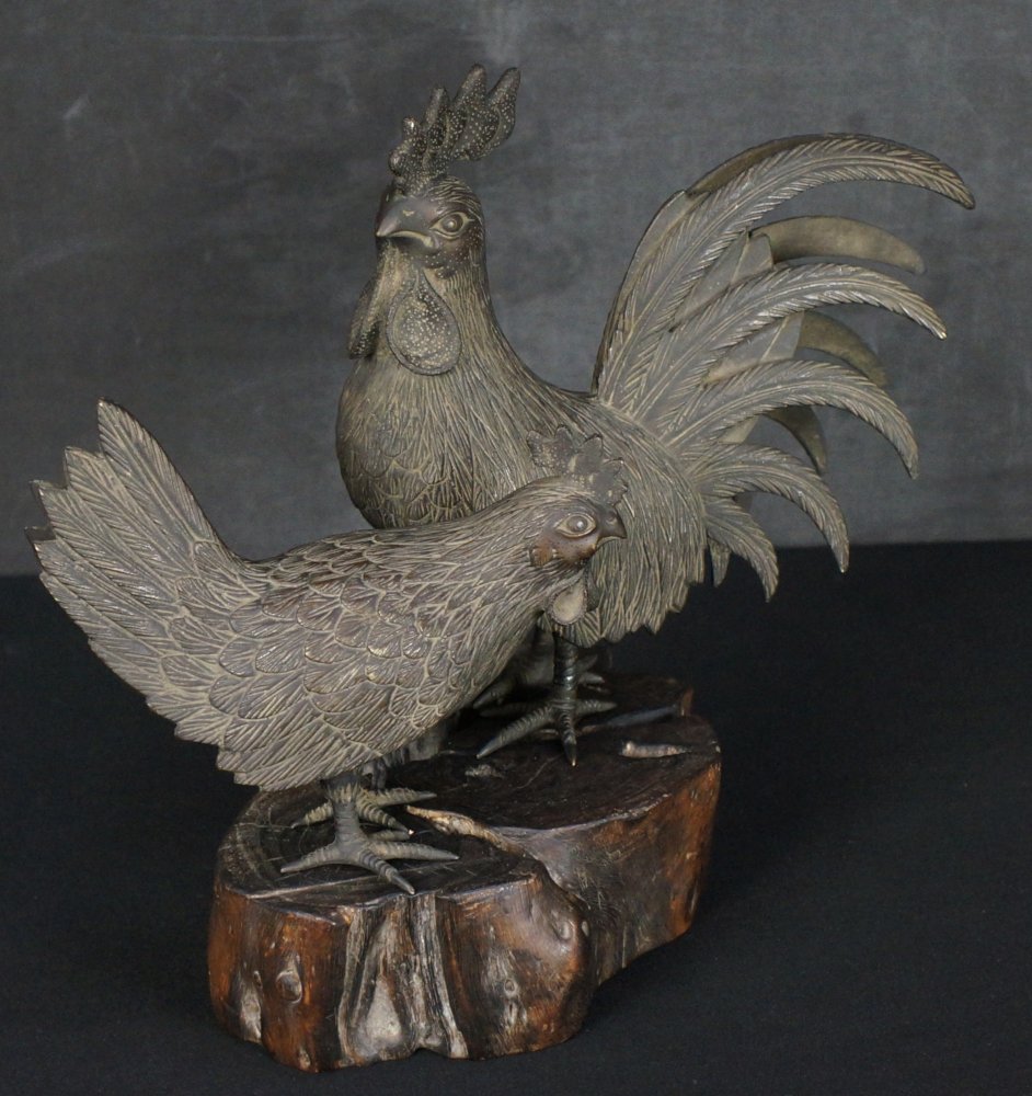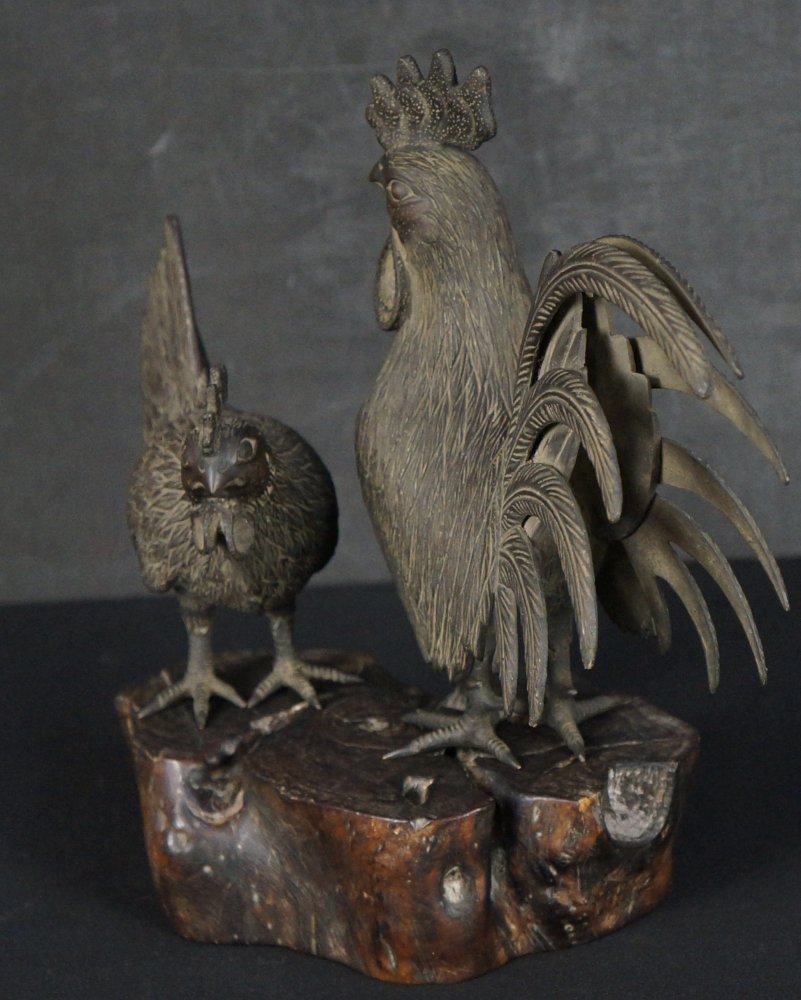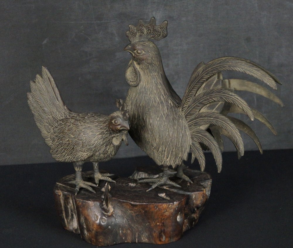 Antique Japanese bronze sculpture group rural seen of rooster and hen  Ondori-Tori, lost wax technique manufacture sculpture, hammering finishing details,  nice patina and shape. Well preserved, some wear  from usage and time, one leg comes out of socket is handled. Immediately usable wood wood base.
