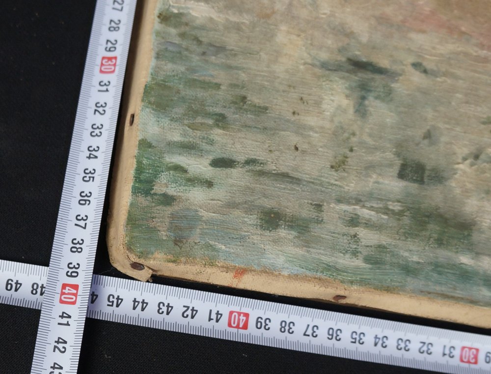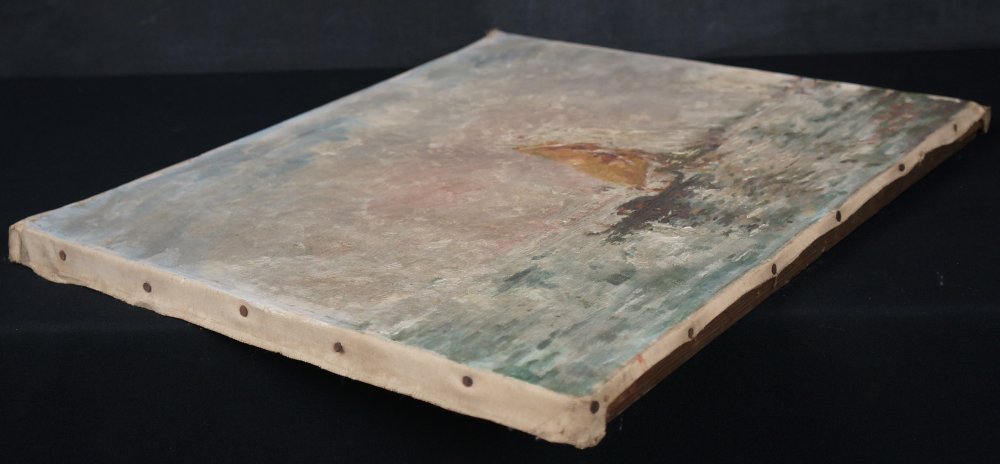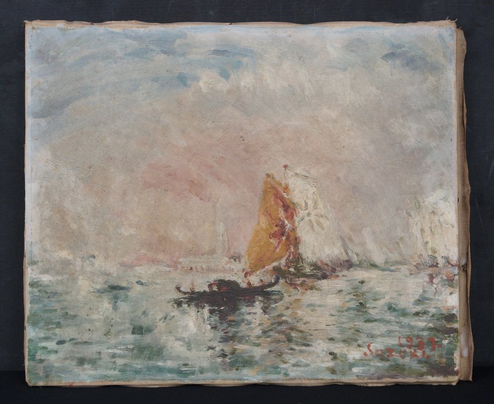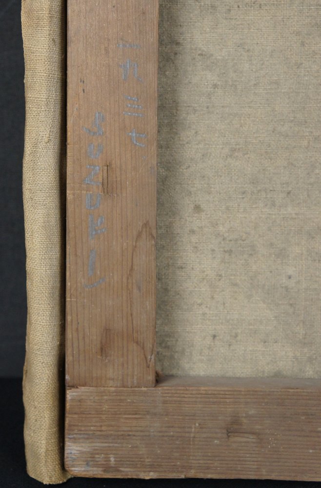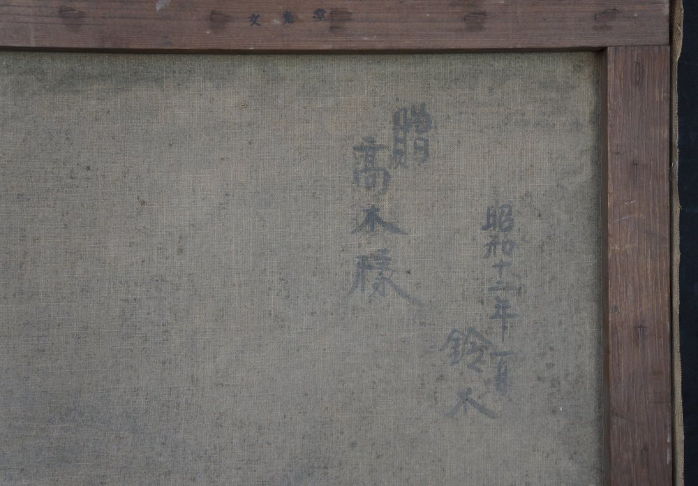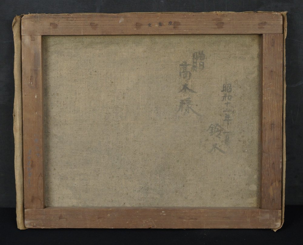 Japanese oil painting of sea landscape, oil on canvas technique. Signed by artist Suzuki 1939, made for a friend as present as stated on back inscription, Vintage Japan art early Showa era.