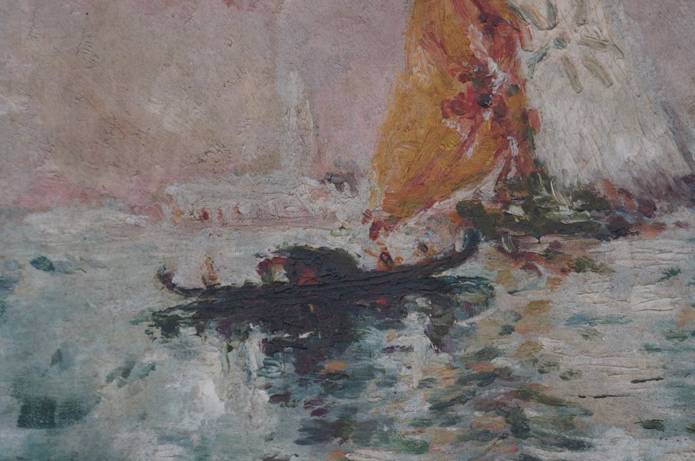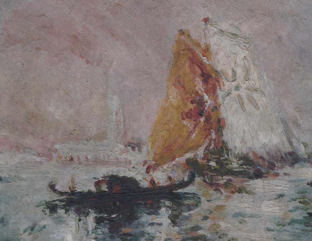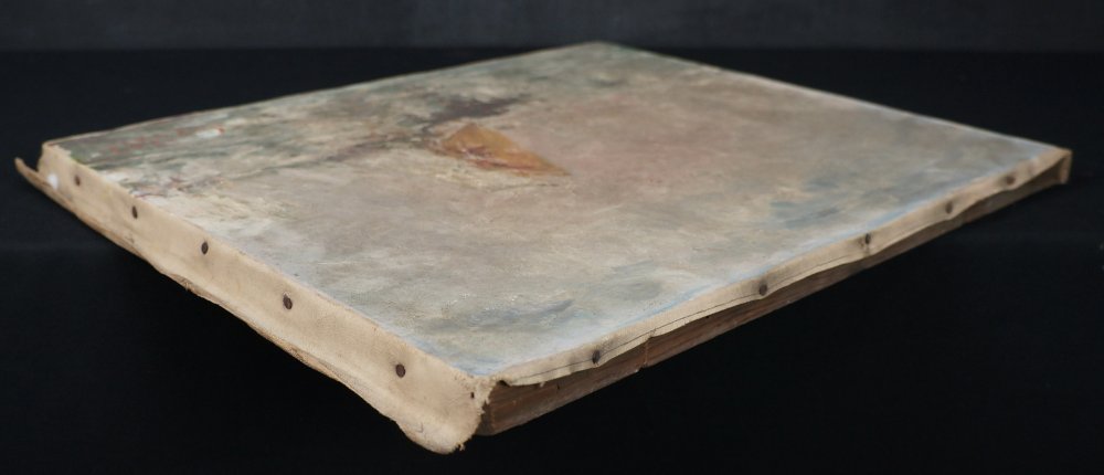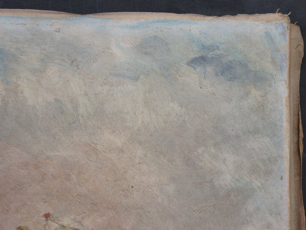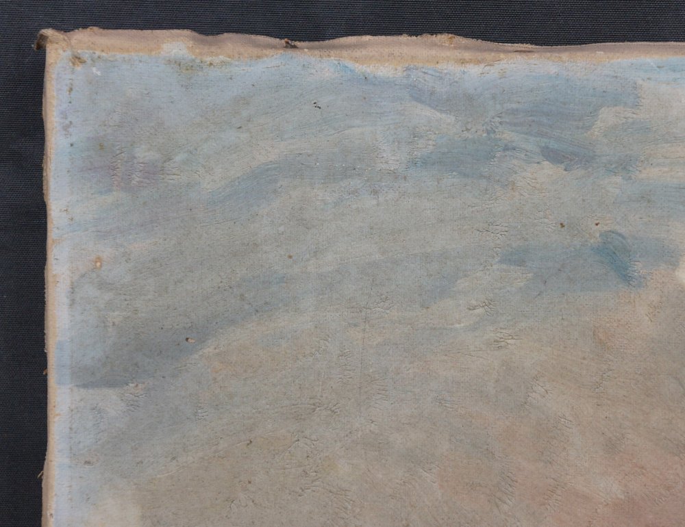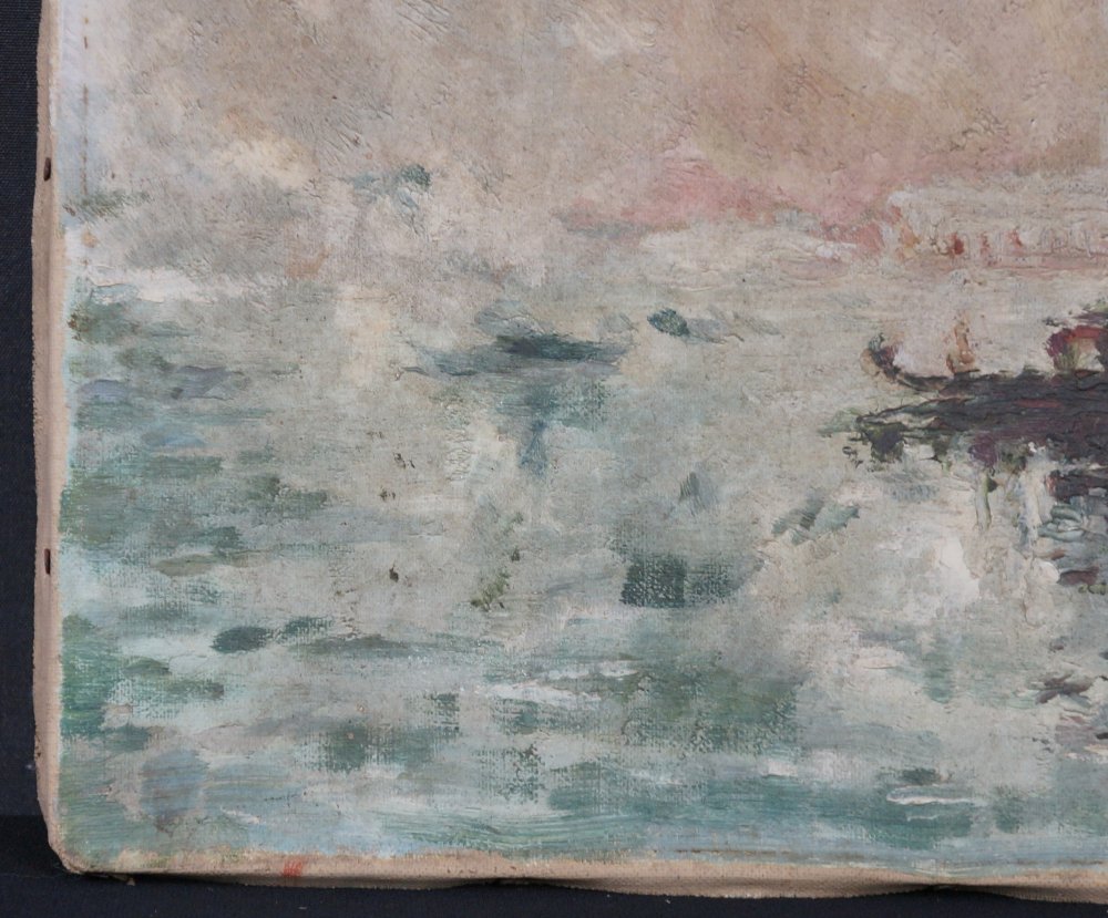 Japanese oil painting of sea landscape, oil on canvas technique. Signed by artist Suzuki 1939, made for a friend as present as stated on back inscription, Vintage Japan art early Showa era.