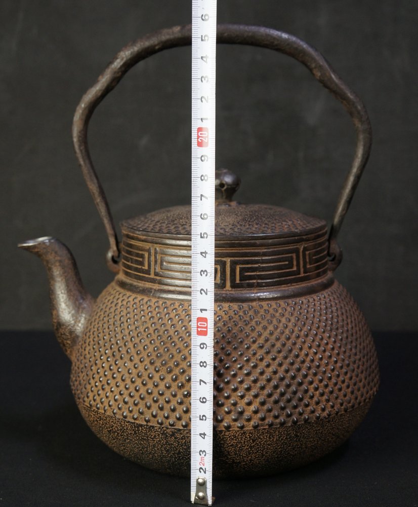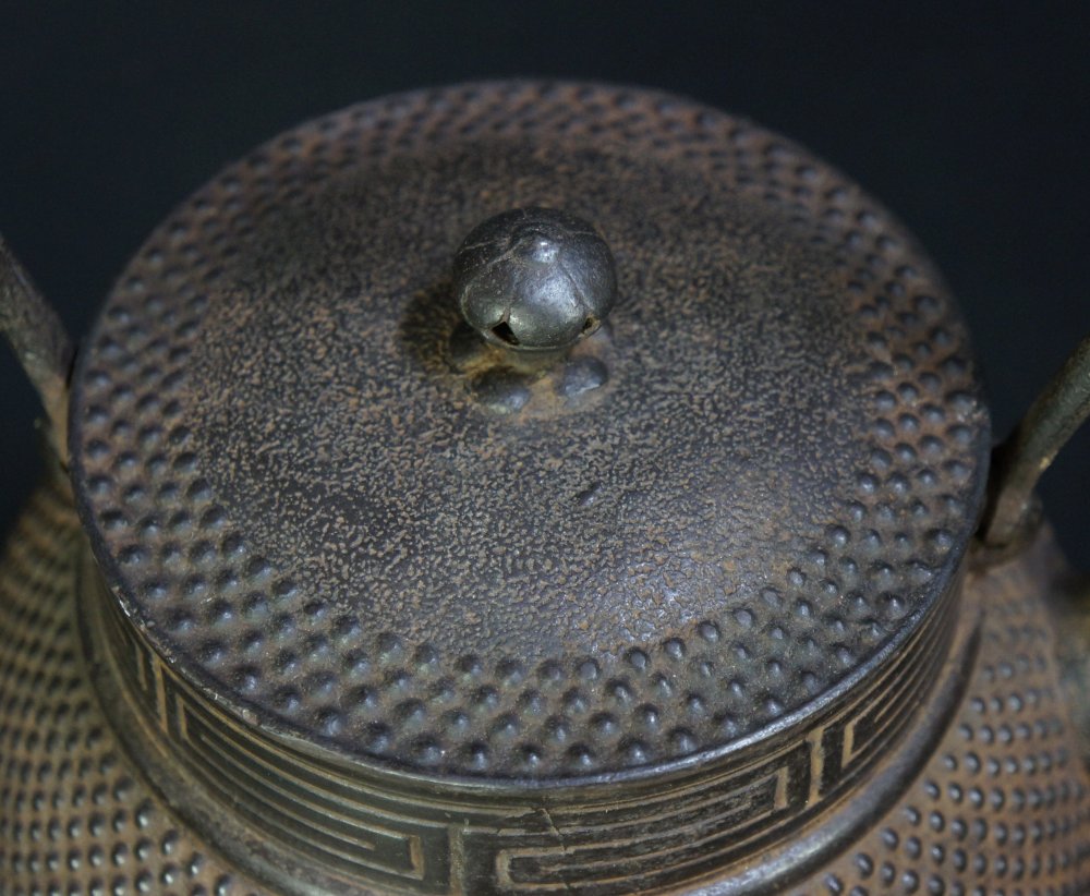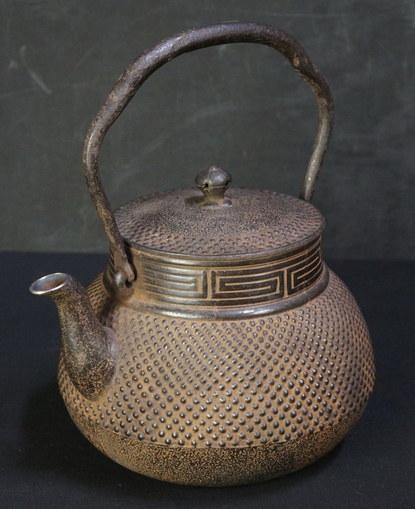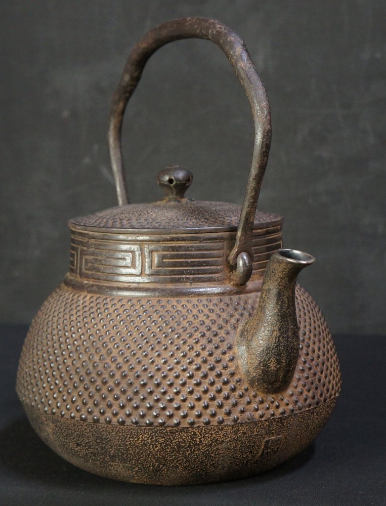 Japanese iron kettle Nambu manufacture, Arare surface and geometrical pattern with silver spout tip. Well preserved, light wear marks from usage, no leaks, no fractures, superficial oxidation. Silver spout tip hammered in to place. Immediately usable for Japanese tea (after proper washing).