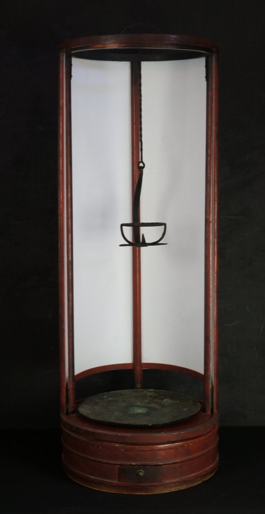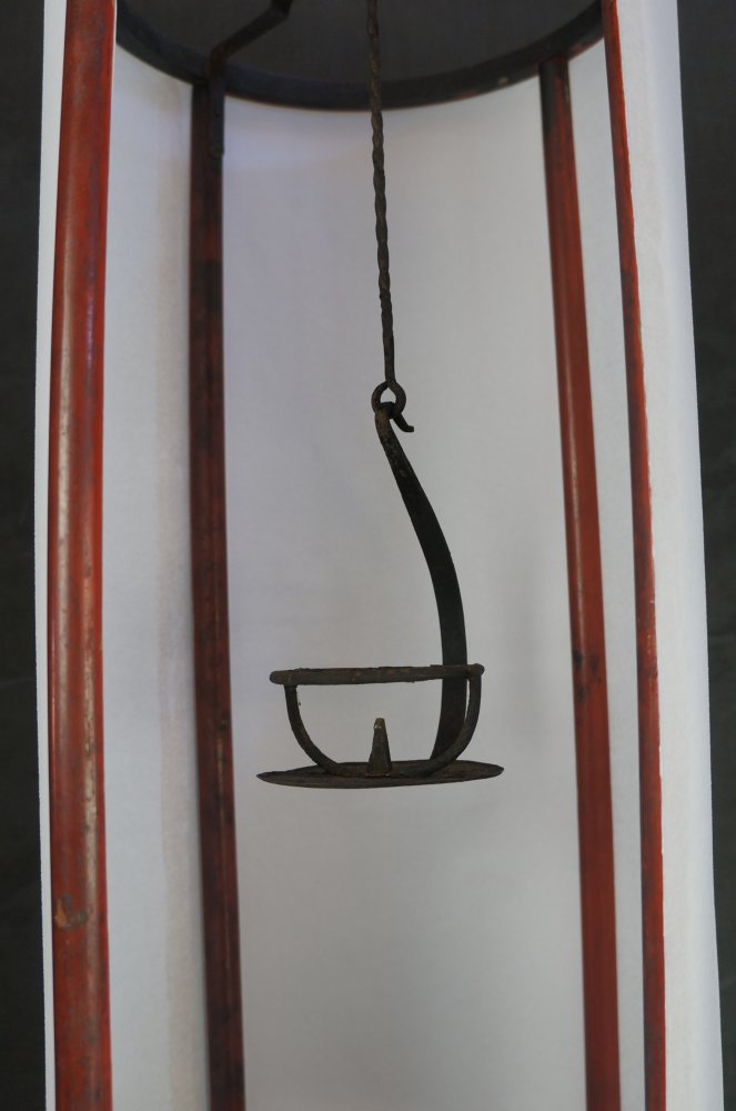 Well preserved antique Maru-Andon lantern traditional Japanese interior. Good conditions, wood structure is well preserved and robust, all parts working. Some wear from time and long usage, paper has been recently replaced. Complete of  iron handle, bronze wax dish and iron pendulum candle holder.