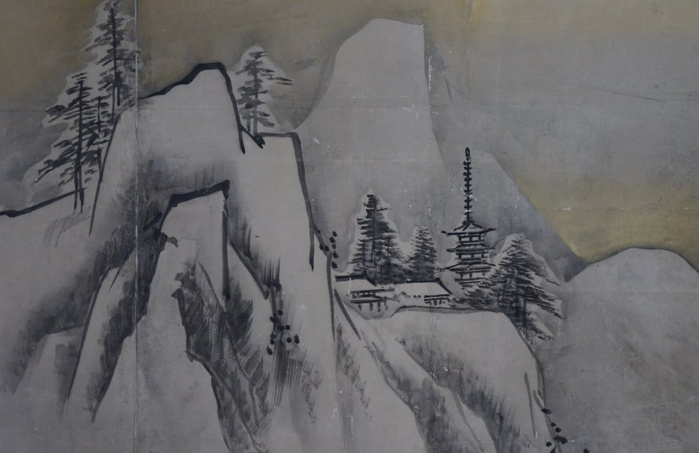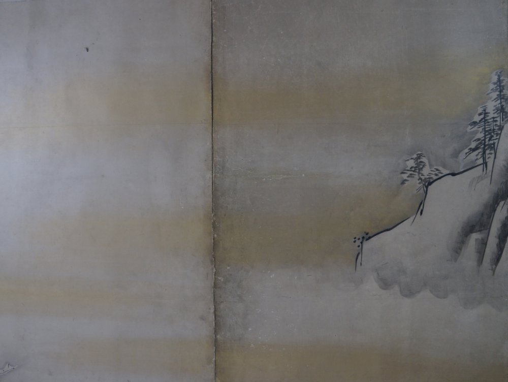A rare and atmospheric Japanese folding screen (Byobu) panel painting, depicting a winter mountain and lake landscape enveloped in floating golden mist. Executed in fine sumi ink and gold dust on paper, this work reflects the refined Zen aesthetics and meditative spirit of early Edo Japan.