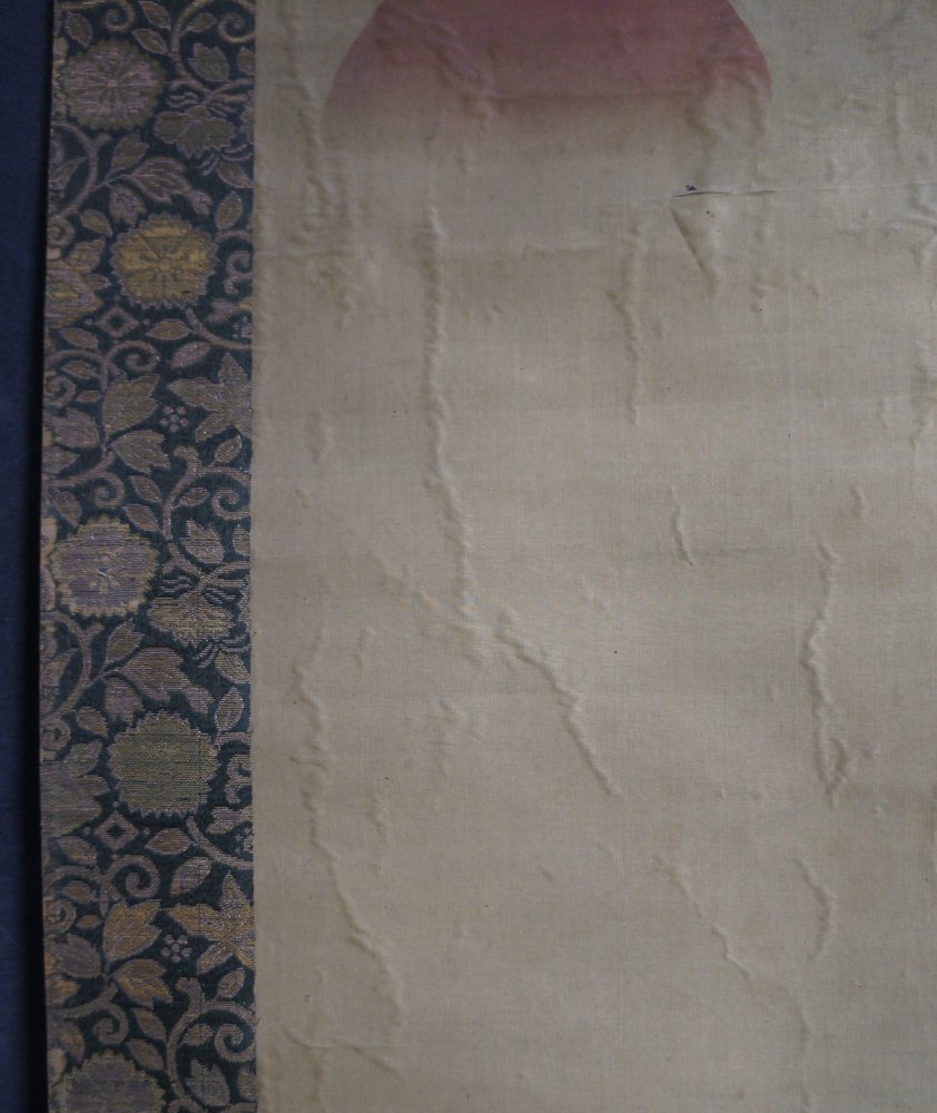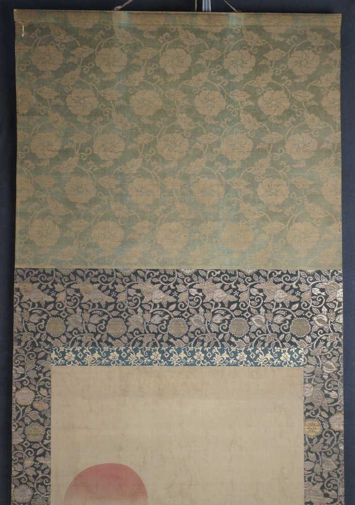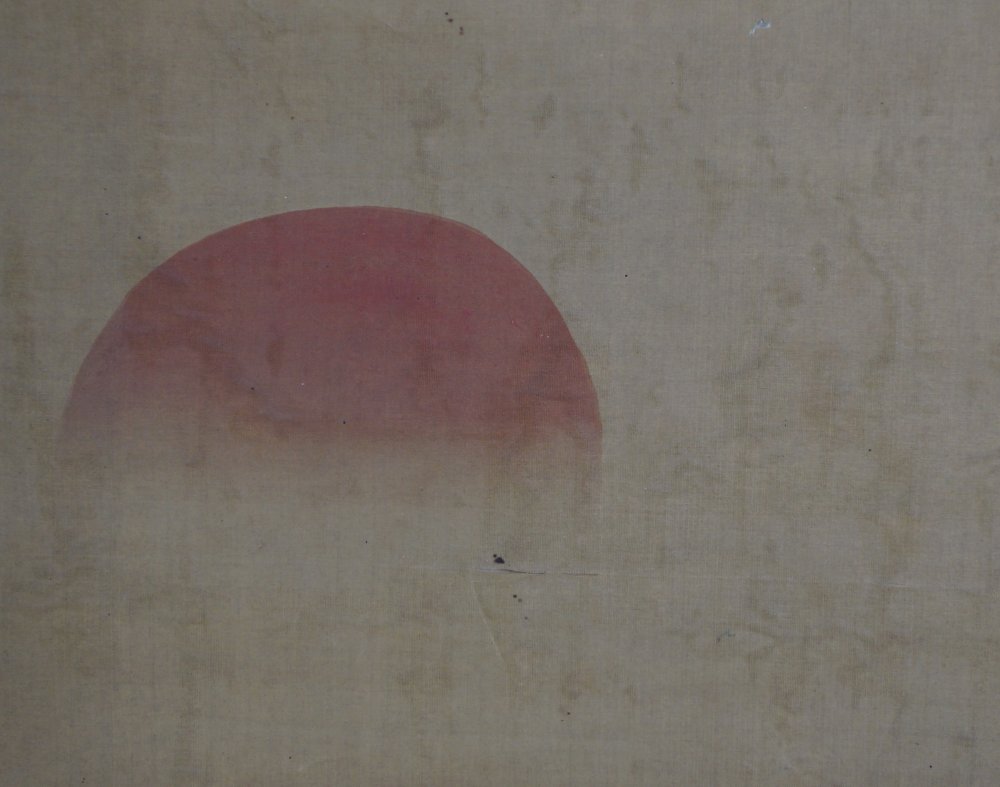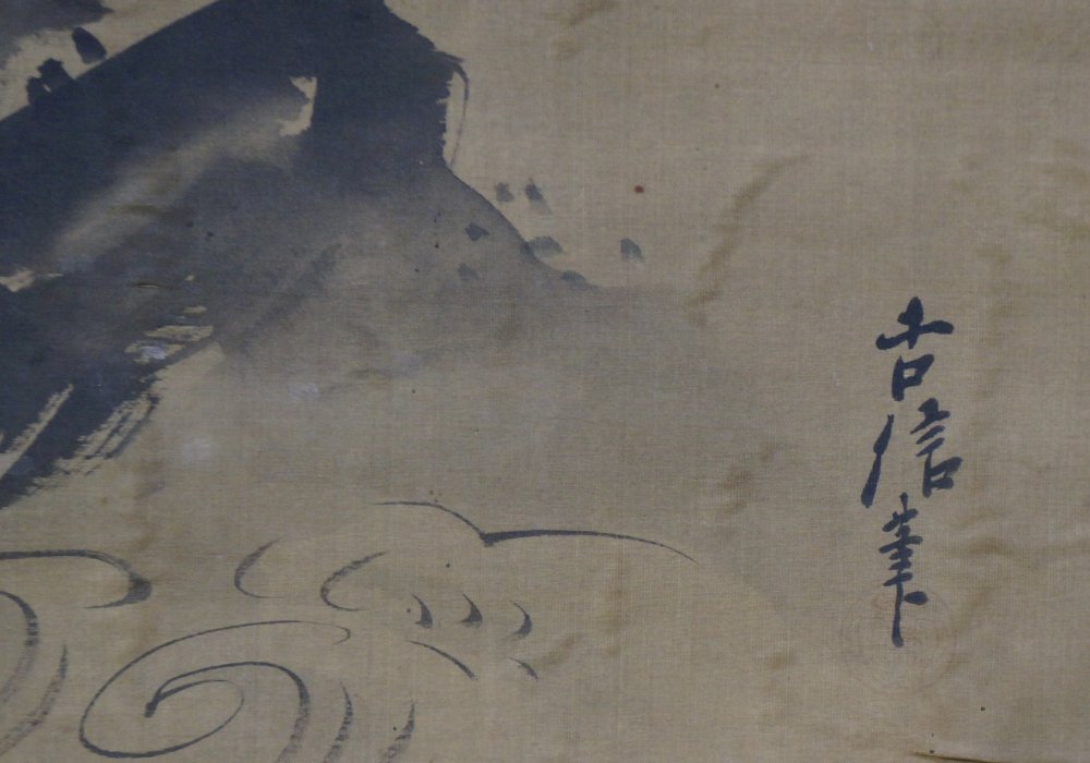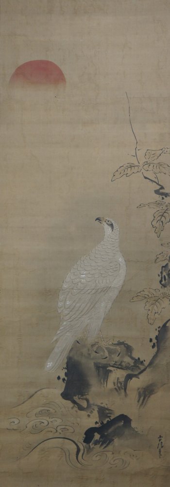 Antique Japanese Asahi-Taka mid Edo era, Sumi-e ink and watercolor technique on fine Kempon silk. Titled Morning sun (rise) Taka falcon on rock by curling waters and tree branch, watercolor on Washi paper technique. Sealed and signed by Kano Eisen Hisanobu (狩野栄川古信 1696-1731).
