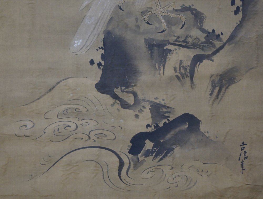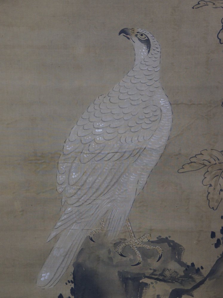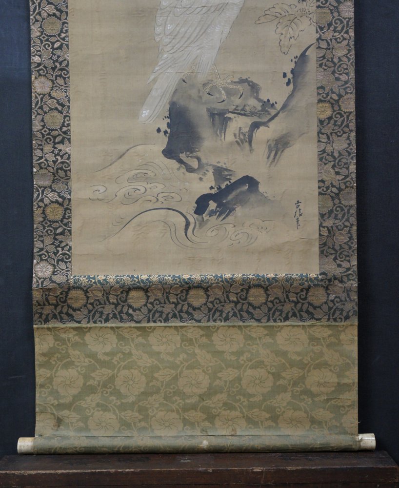 Antique Japan white Taka falcon scroll painting Kano Eisen 1700 mid Edo art