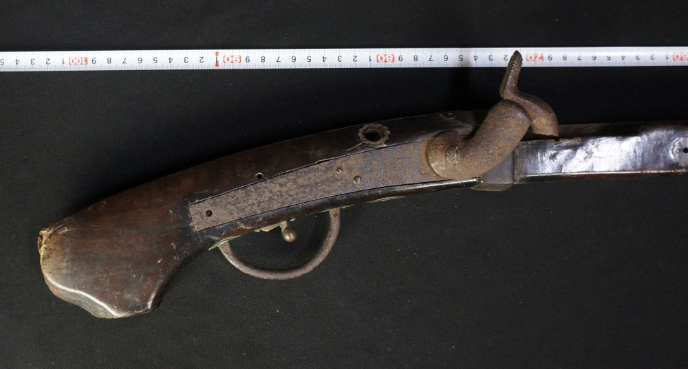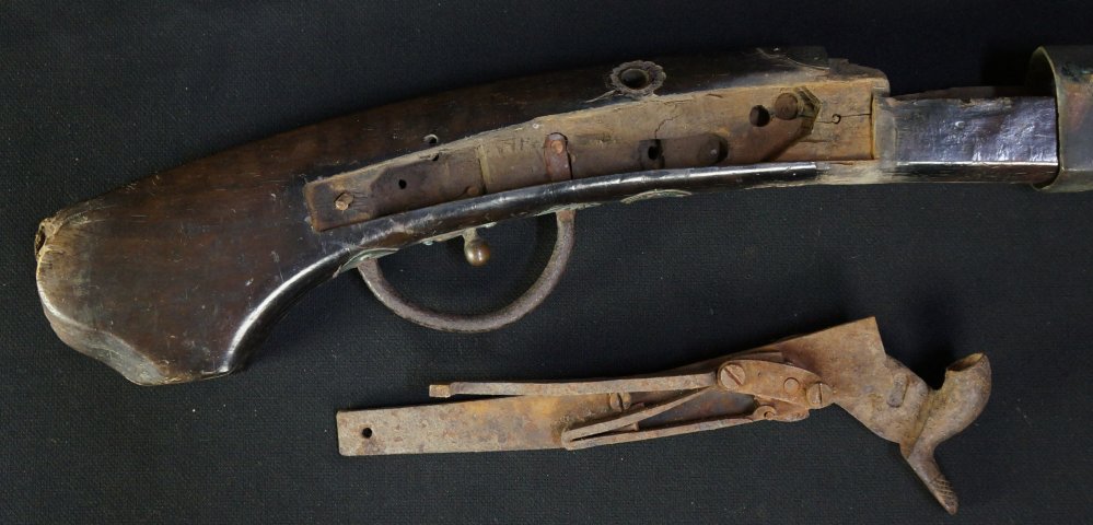 Antique Samurai matchlock musket wood shaft and working trigger mechanism in original conditions as found, modified in 19th century. Extensive wear use and oxidation, inlaid bronze decorations. Historical firearm.