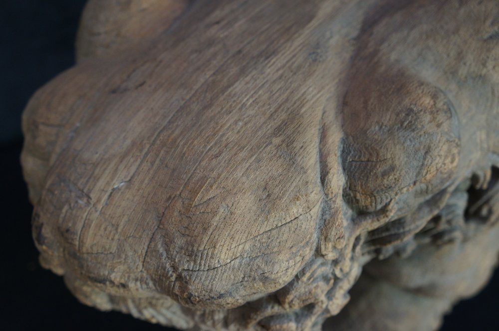 Antique Japanese Buddhist temple Keyaki wood carving statue from inner column roof decoration (please see last image). Fine carving from master carpenter Miyadaiku craftsmanship, interlocking joint into the temple column. Medium conditions, wear from time and exposure to elements, dramatic effect of wood aging. 2 long iron nails on back area as part of old temple restoration.