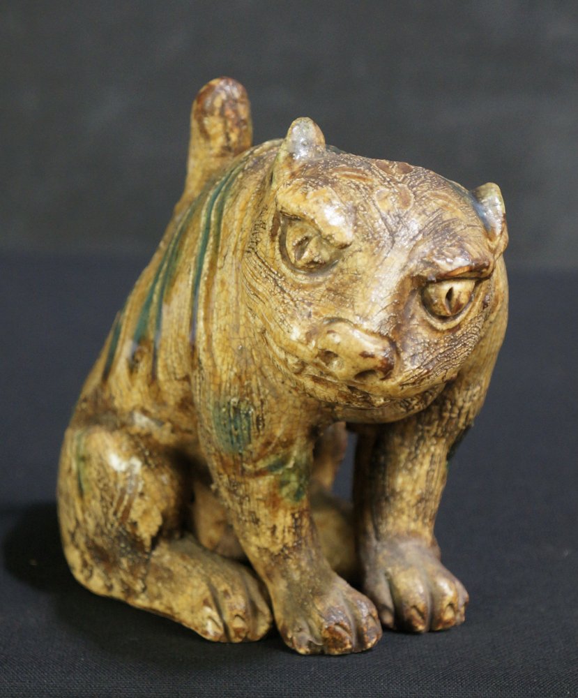 Japan ceramic tiger cat Shikiyamayaki sculpture craft 1900 Oribe kiln manufacture