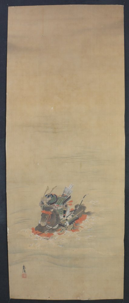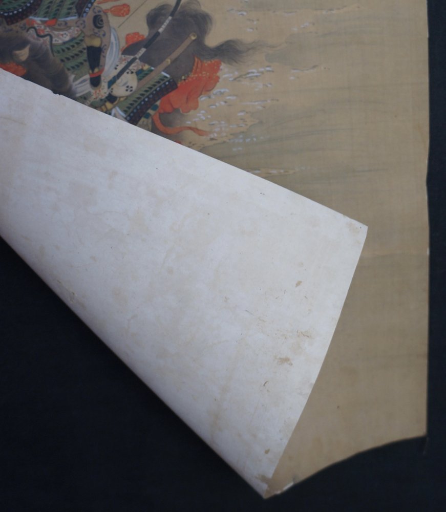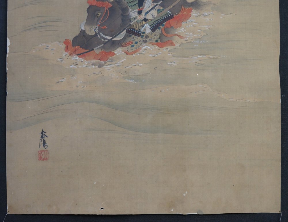 Antique Japanese Samurai on horse painting, Sumi ink and watercolor technique, nice armor details, painted on Kempon silk aplyed on paper. Medium good conditions, some wear from usage and time, sealed and signed by painter. Japanese Imperial Samurai book.