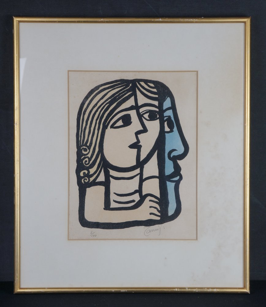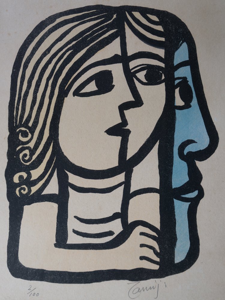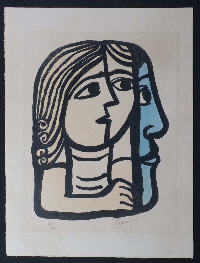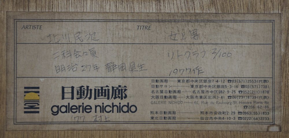 Original Japanese master Tamiji Kitagawa (北川 民次 1894 - 1989) lithography titled Woman and Man 2/100, signed by Kitagawa Tamiji (民次北川) 1977. Kitagawa period of involvement in social art open scool Nagoya Zoo Art School. Good conditions, some wear from time and light exposure. Japan modernist art