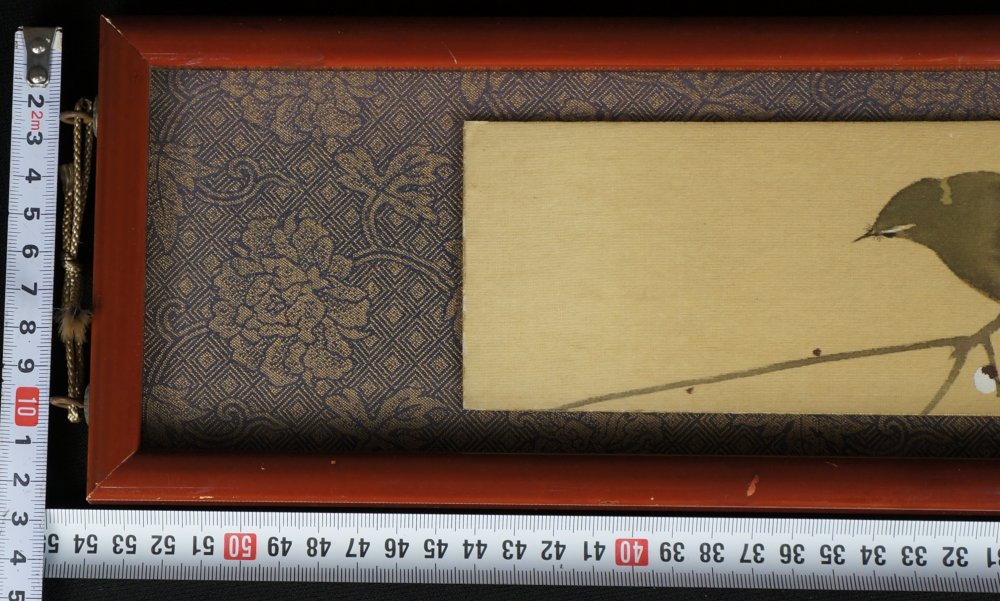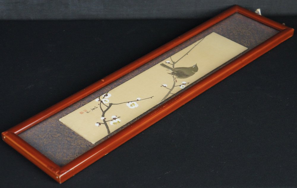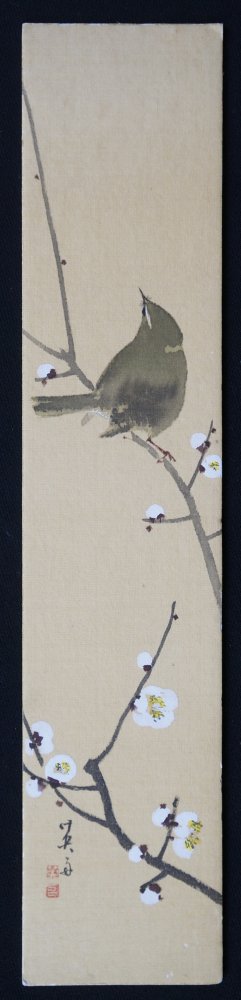 Vintage Minimalist Japanese Uguisu bird on Ume plum tree blouming branch, early srping seson painting, watercolor painting technique on Tanzaku, poetical Haiku behind the painting (not interpretable). Signed and sealed by Yamada Yataro (山田彌太郎). Nice free hand painting, light wear from time and usage, good conditions.