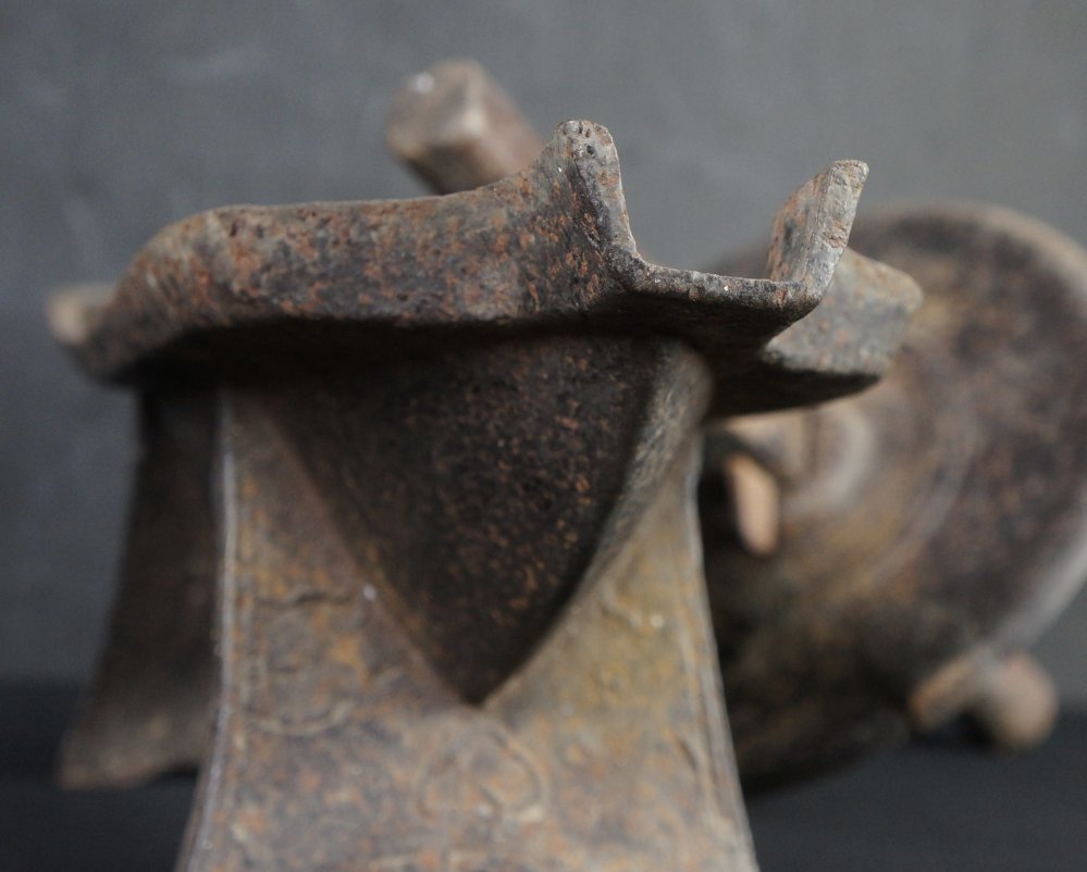 Antique Yagen Japanese bronze medicine grinder for Japanese remedy herbal medicine  (Kampoyaku 漢方薬 Japanese medicine). Cast iron lost wax technique craft, in use for a long perios of time with several antique hammered bronze restoration by blacksmith. Very interesting medical tool of Edo era Japan, nice patina and craft, extensive wear from usage and time. Item can still work for grinding, immediately usable.
