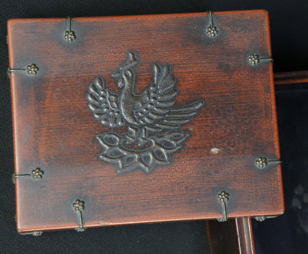 Japanese lacquered wood box Hako with phoenix decoration and bronze fittings, nice lacquer craft. Medium good conditions, some wear from usage ant time. Immediately usable.
