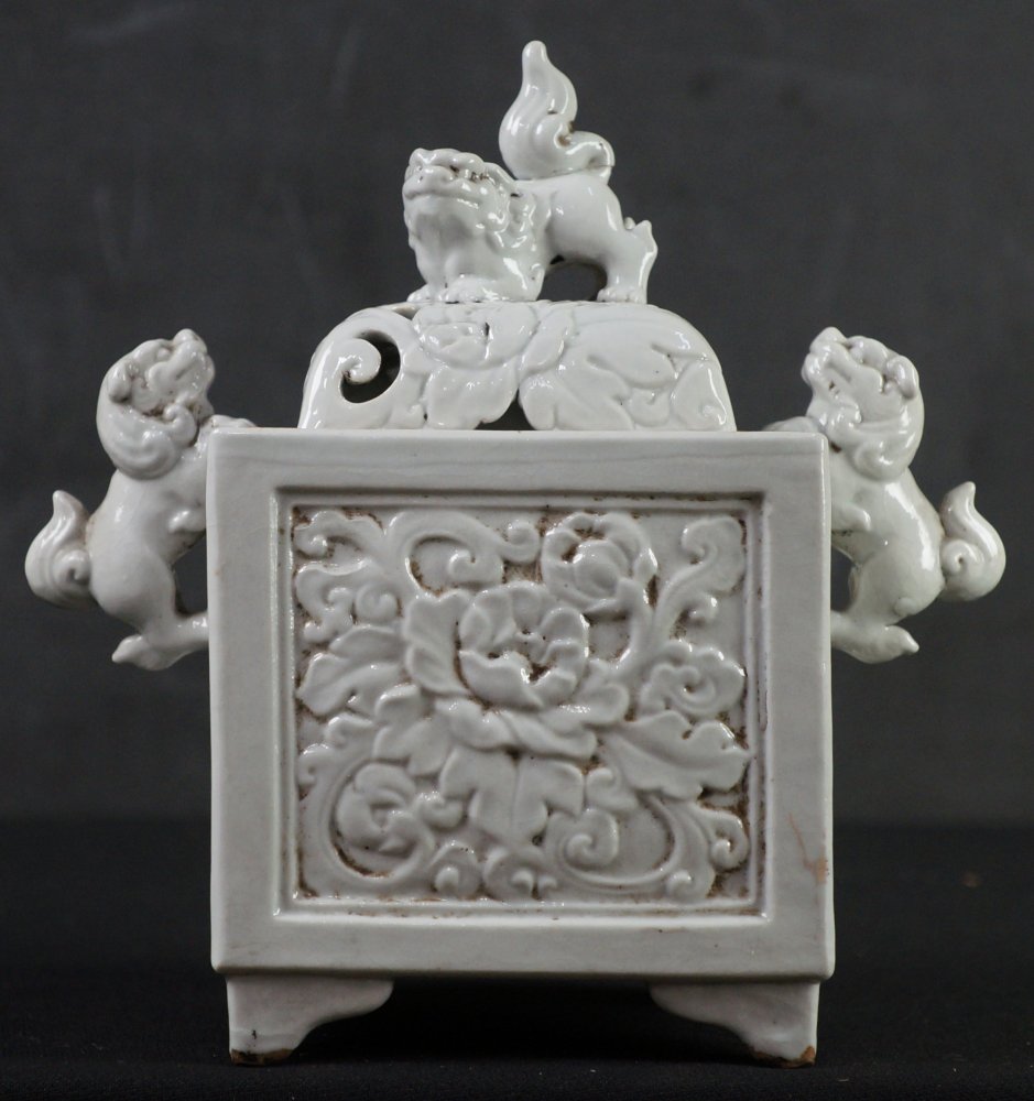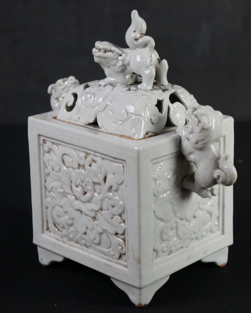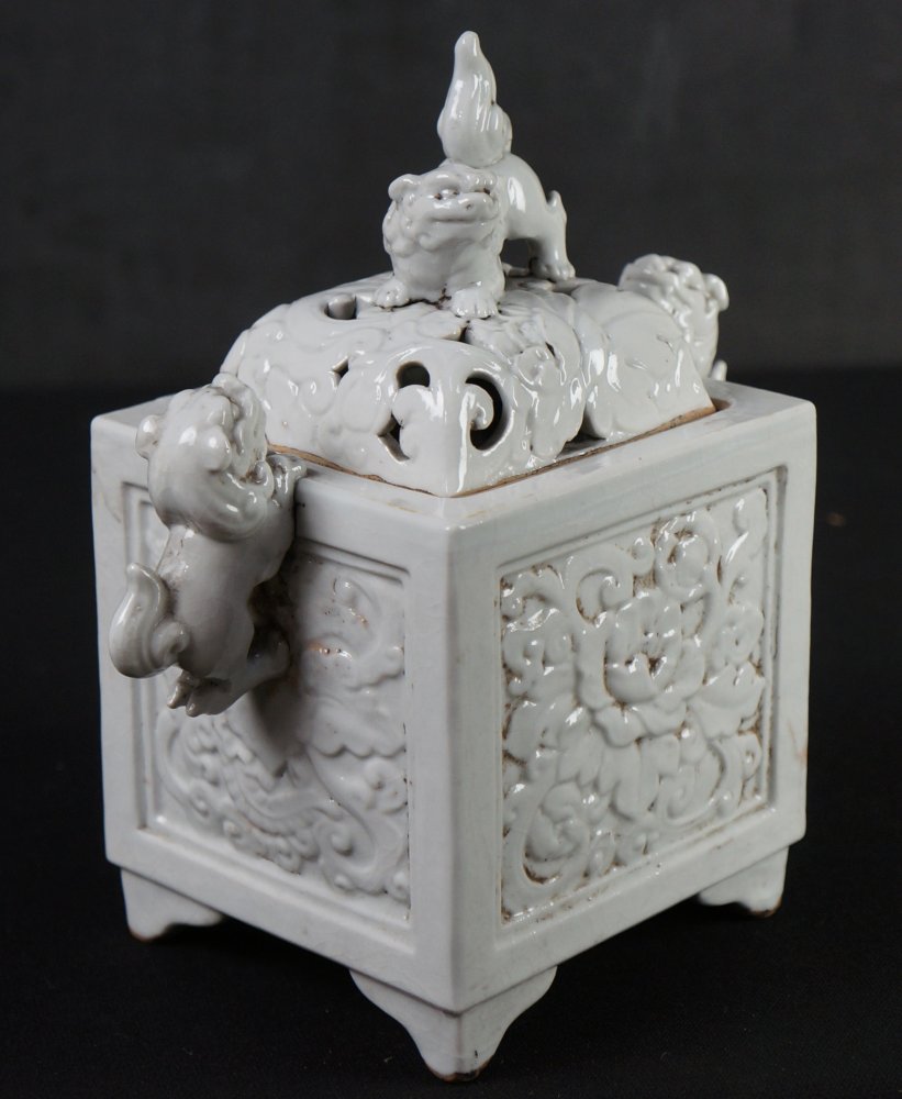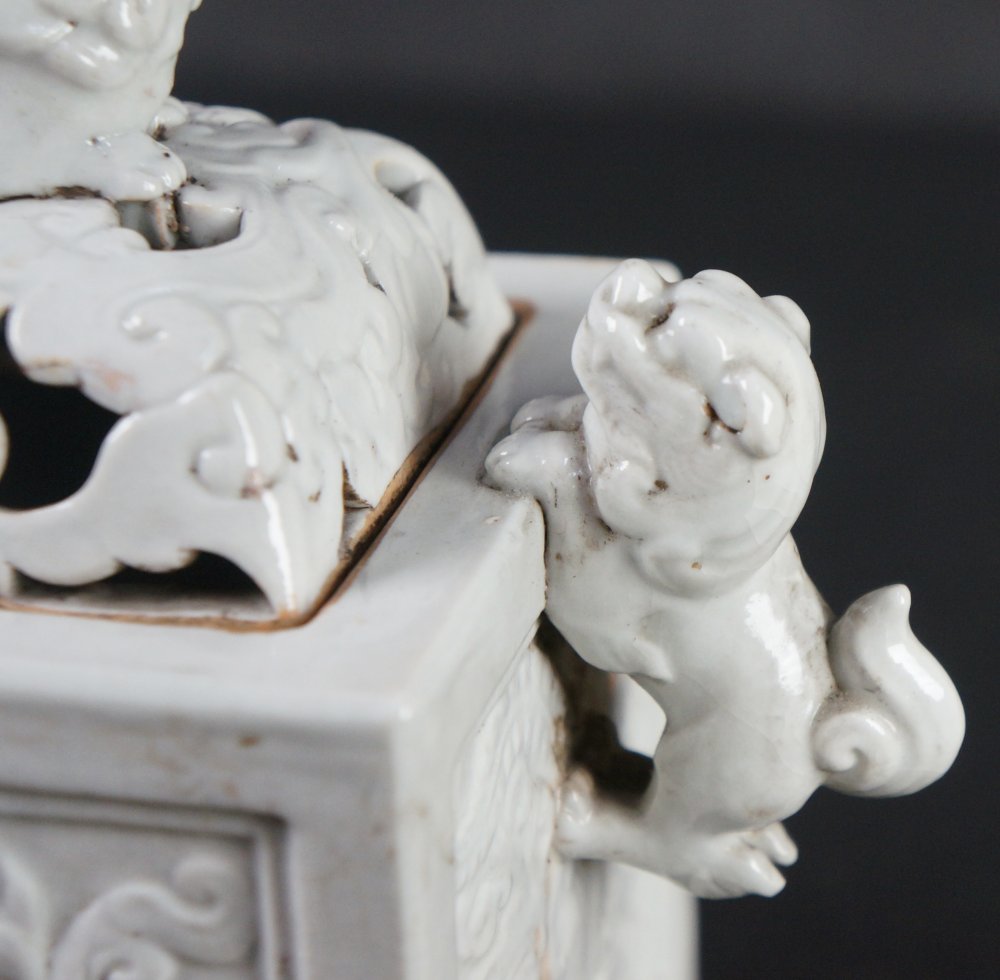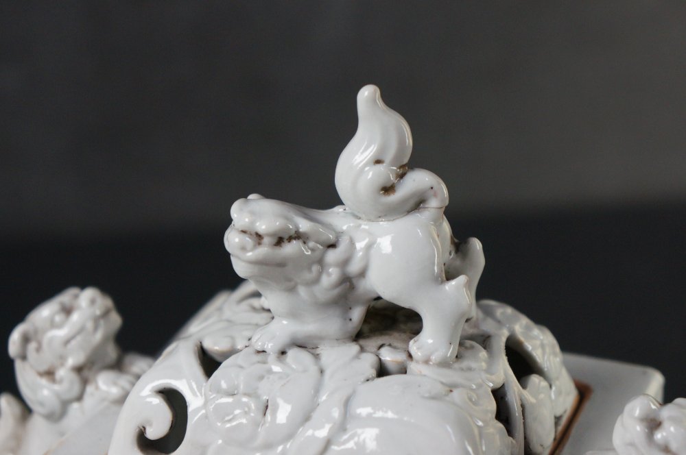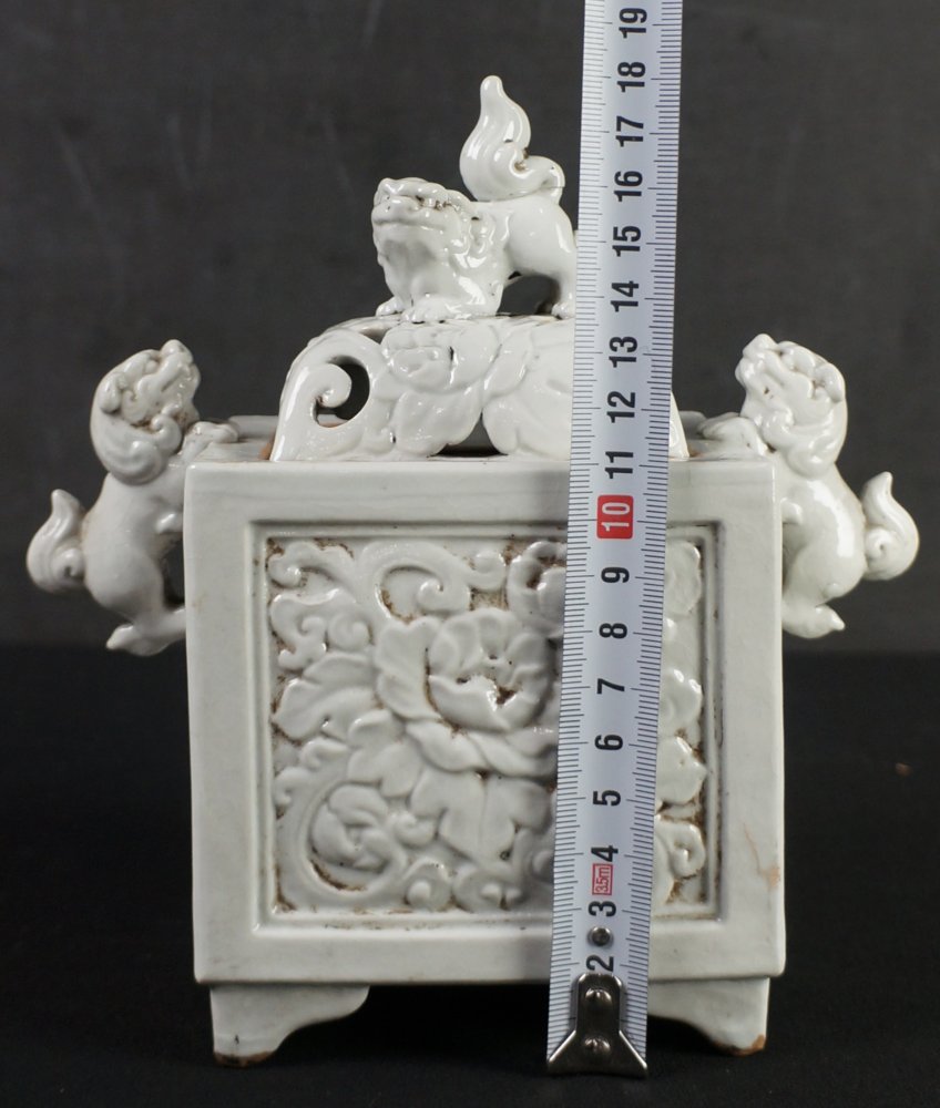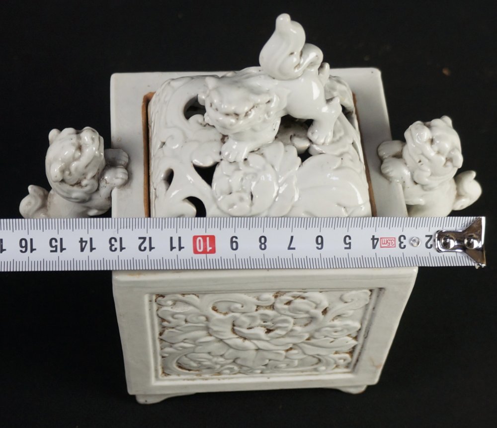 Fine antique Japanese Sometsuke-Koro ceramic censer, decorated with Shihi lion lid and large floral design in relief on the front panel. It has four feet and 2 guardian lion figures (Shishi / Foo dogs") as decorative elements. Well preserved, restoration on top Shishi lion tail. Complete of protective wood box. Immediately usable.