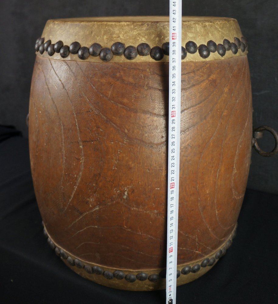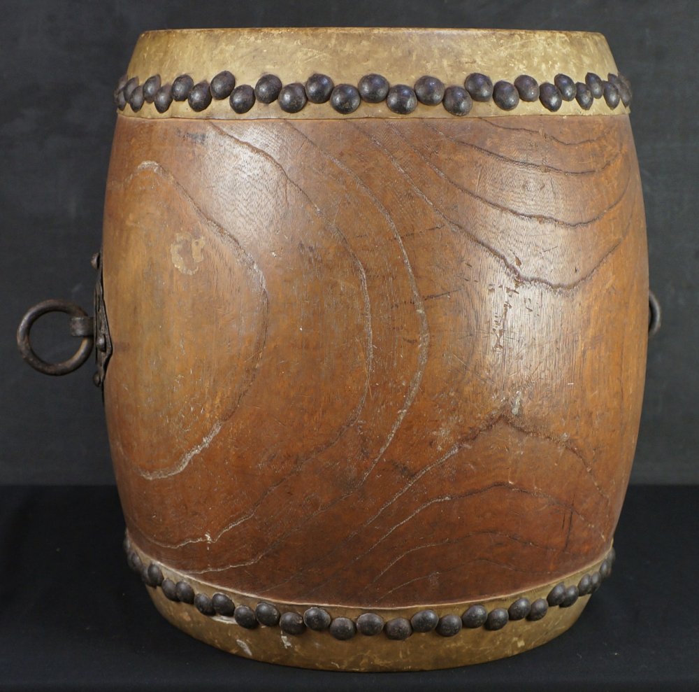Big size antique Japanese Buddhist Taiko drum made from single Kayaki wood tree stump, skins are worn, low retaining tension but intact, used until recently, mice patina and surface. Solid wood structure, nice iron metal fittings. Historical instrument.