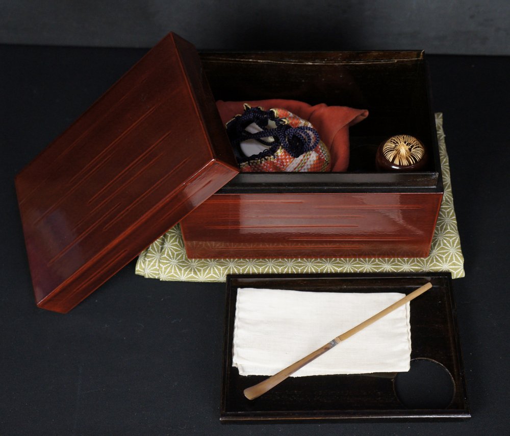 Nice Chabako for Tea Ceremony set complete of ceramic Chawan,  tea tools, all harmoniously balanced for Japanese green Tea Ceremony. Chabako box in good conditions, light wear from usage, immediately usable with Furoshiki silk wrap.