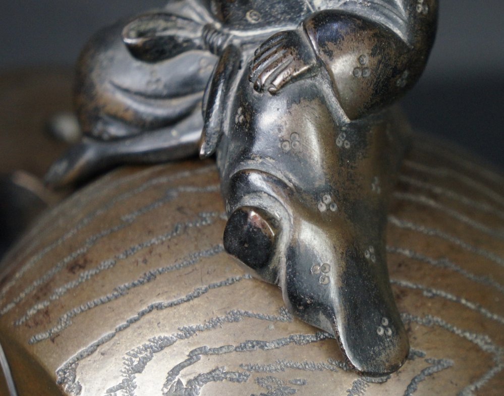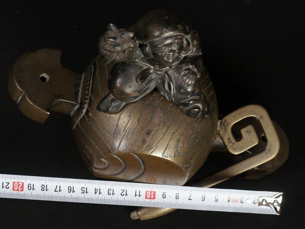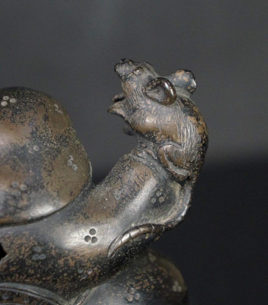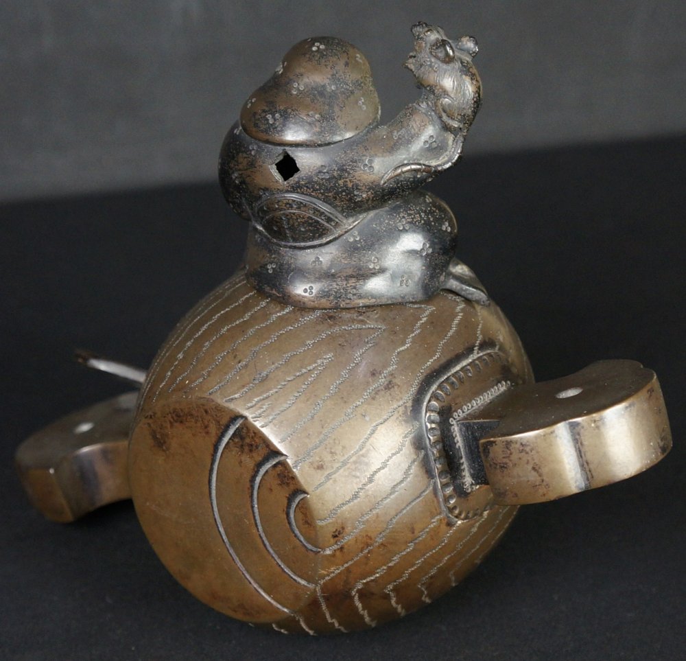 Vintage Koro censer Japanese lost wax sculpture technique craft, inner earth mold still visible. Well preserved Japanese deity seated on its Kozuchi hammer and key holding a small mouse, incense smoke hole on the back, immediately usable.