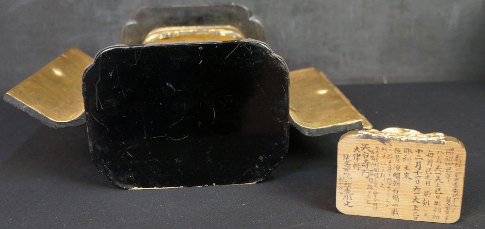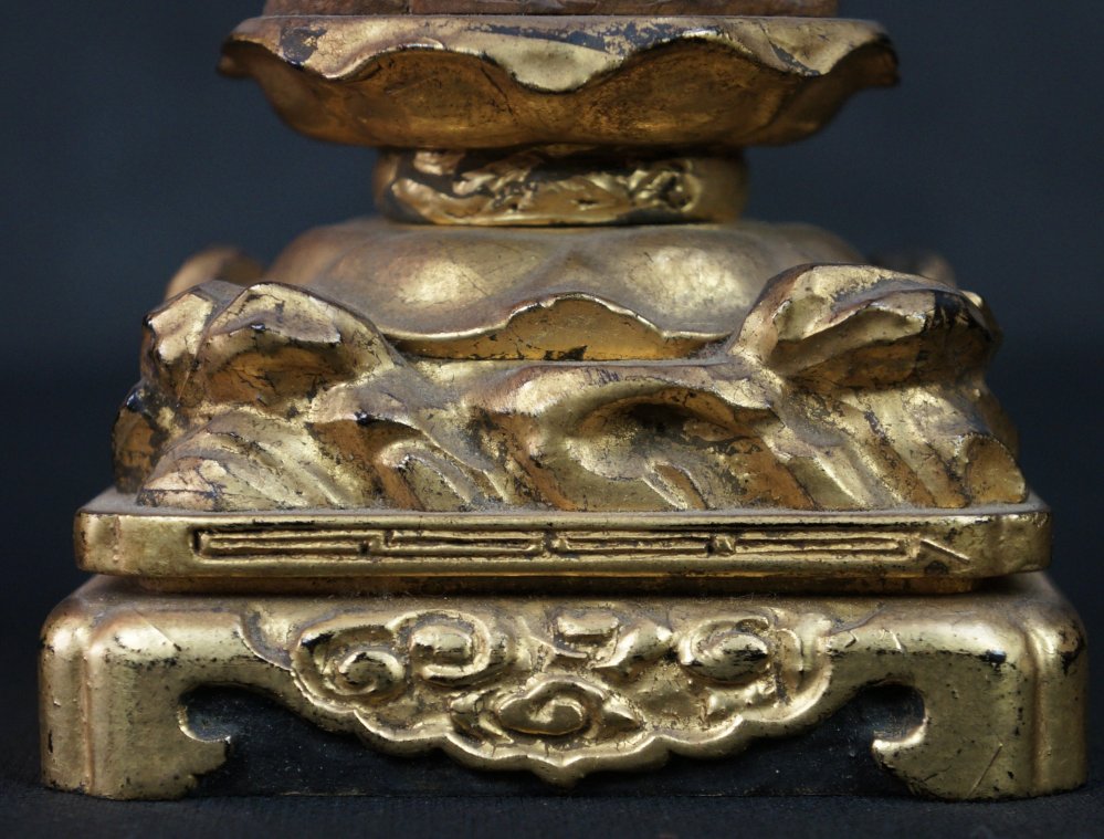 Japanese esoteric Buddhism shrine Myoken Butsuzo sculpture heavenly guardian deity seated on lotus, wood carving with pigment and gold leaf, in original conditions from Shrine. Bottom inscription: Buddhist writing referring to Tanshu-ji temple (Nagano), made by Great Master Dairitsu-shi (temple monk) Nice patina and aging, rural Buddhist temple craft. Good conditions, some wear from time and usage. Historical sculpture.