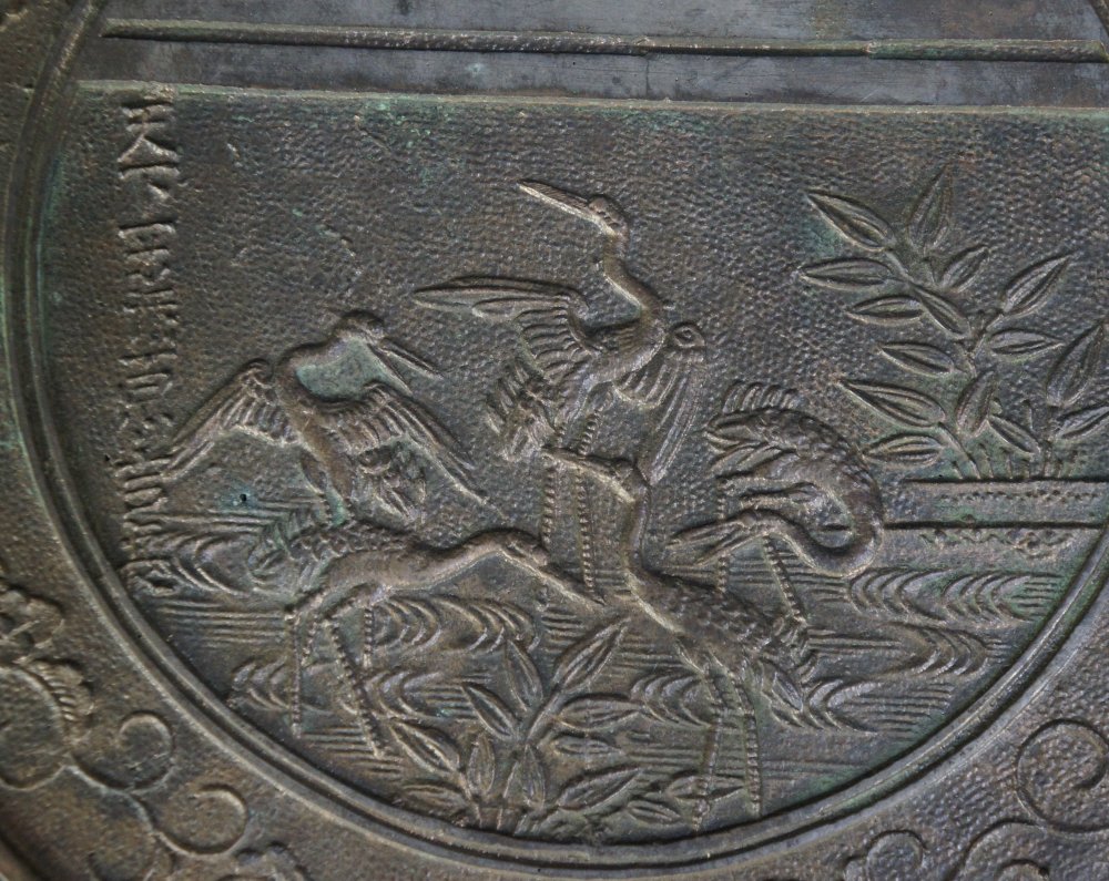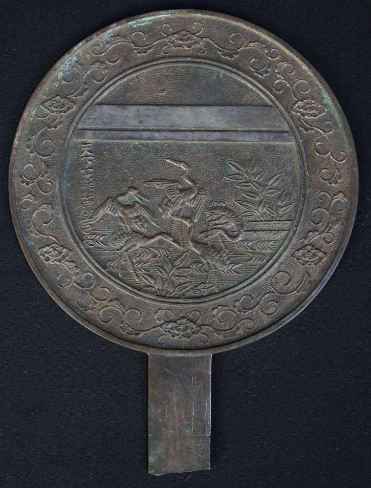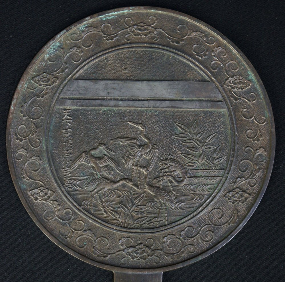 Nice antique Japanese mirror decorated with Tsuru birds. Nice patina medium good  conditions, wear from time and long usage, no longer reflecting. Nice historical item.