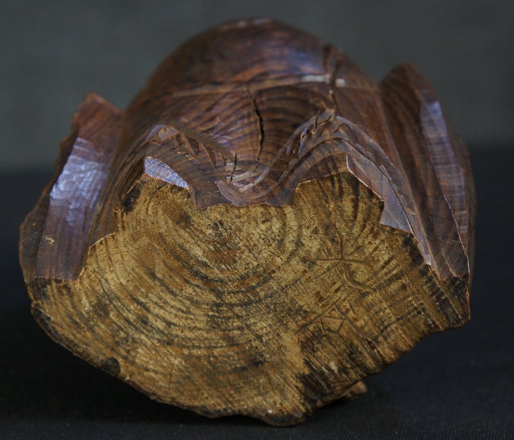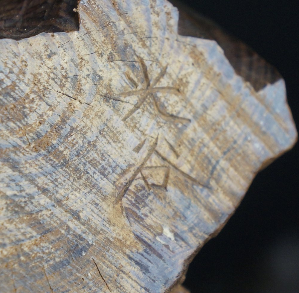 Wabisabi Japanese Hotei fortune deity sculpture from rural Japan, Kibori wood carving technique, signed by Mitsutani (光谷). Single wood block carving, medium conditions wood expansion and wear.