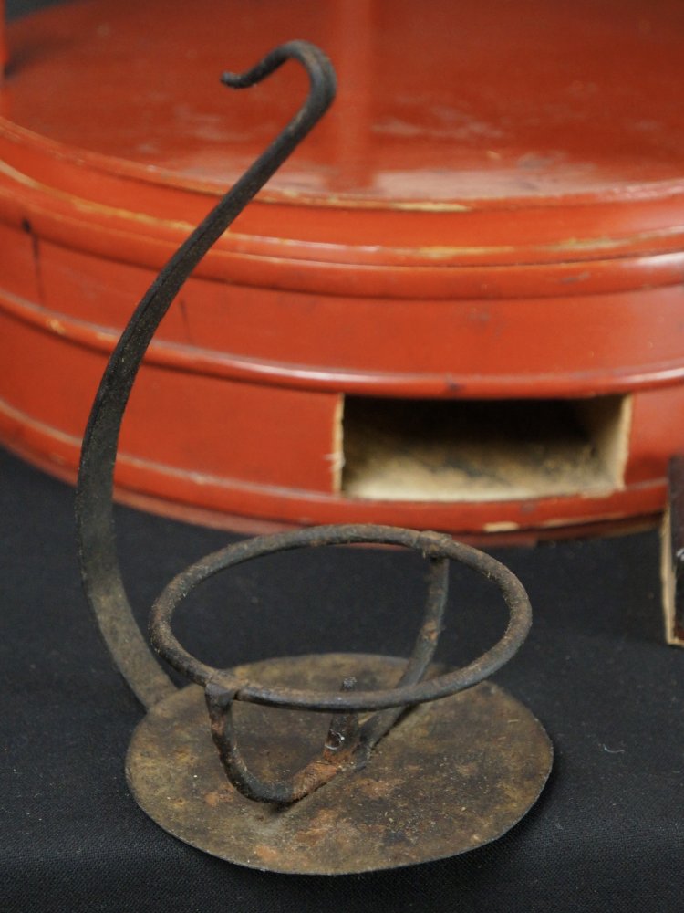 Well preserved antique Maru-Andon lantern traditional Japanese interior. Good conditions, wood structure is well preserved and robust, all parts working. Some wear from time and long usage, paper has been recently replaced. Complete of  iron handle, iron pendulum candle holder.