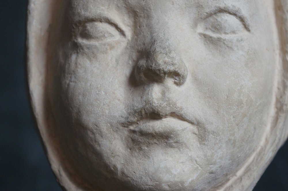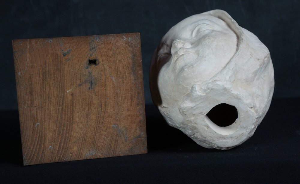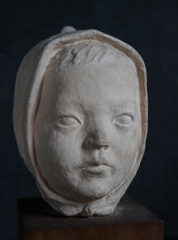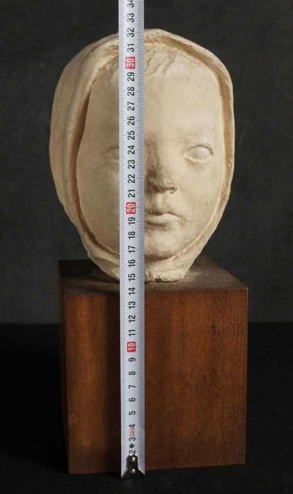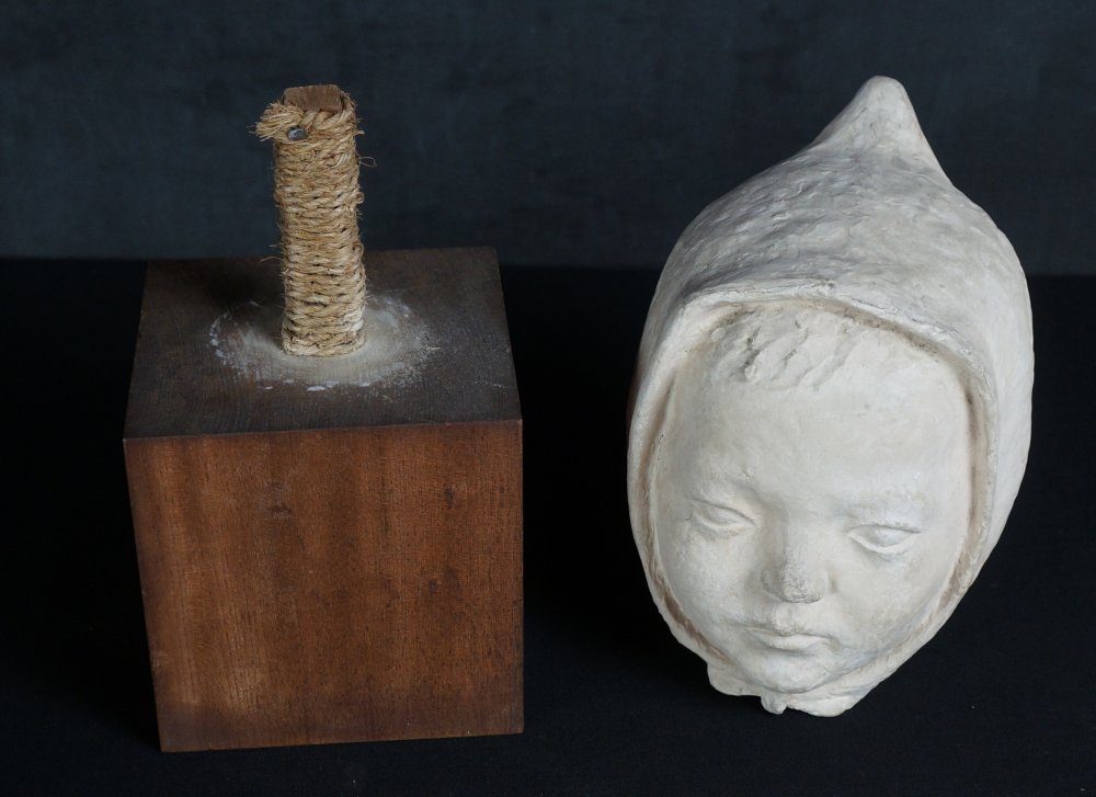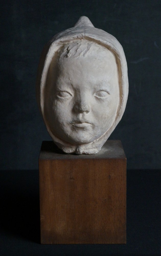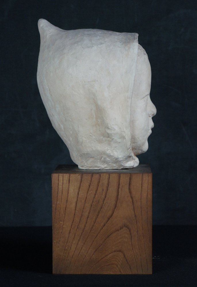 Japanese child Minimalist sculpture, Child with hat portrait sculpture, modeled from plaster technique, nice surface and shape, wear marks from time and handling, no artist sign visible, complete of wood base.