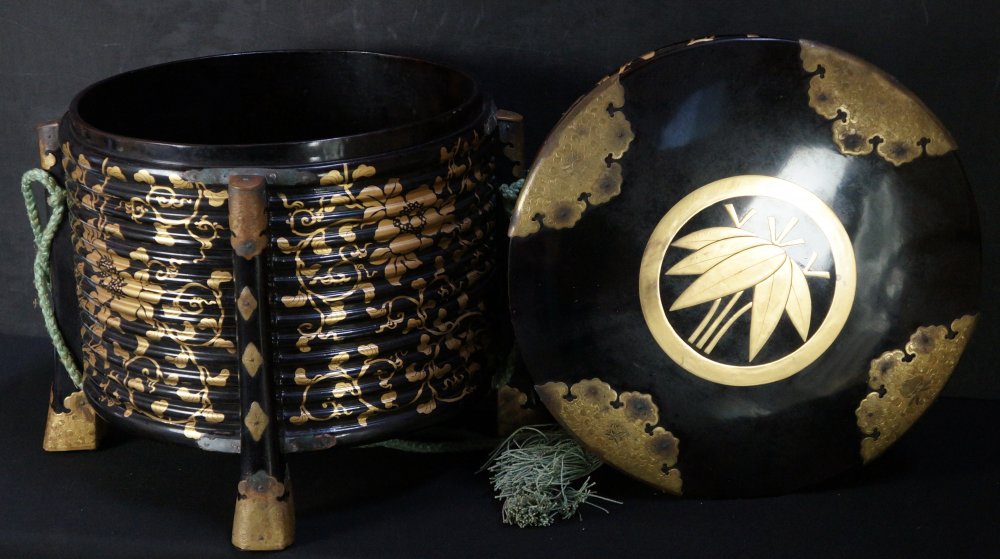 Antique Japanese Ohira lacquered wood box for ceremonial use, well preserved with family Mon clan symbol on lid Sasa (笹) bamboo leafs. Hammered bronze protective plaques and silk rope. Large size offering container, some wear from usage and time, silk ropes. Nice lacquer wear with gold Maki-e ornamenltal floral motif.