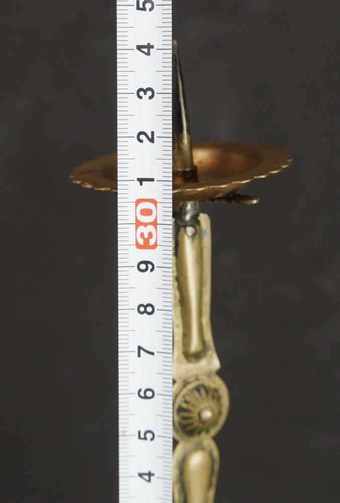 Antique Japanese Edo era Rosokutate collapsible candle stand. Used by Buddhist monk for out door chanting. Simple and functional bronze craft technique, nice patina. Medium good conditions, strong joints, some wear from usage and time, old restoration by the tip, wax sediments. All original parts in place, immediately usable.