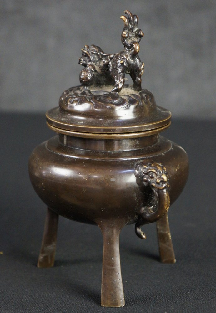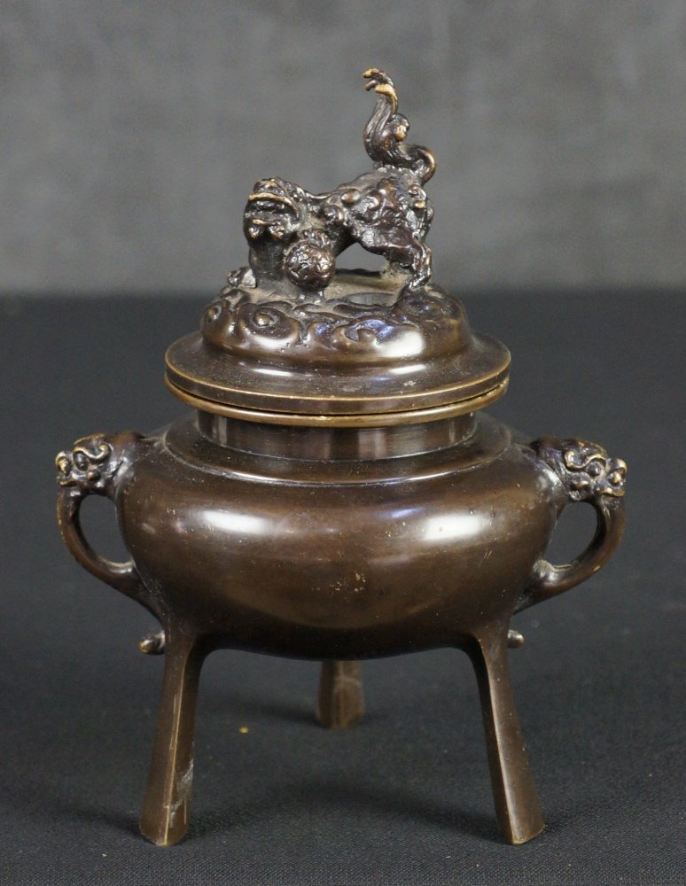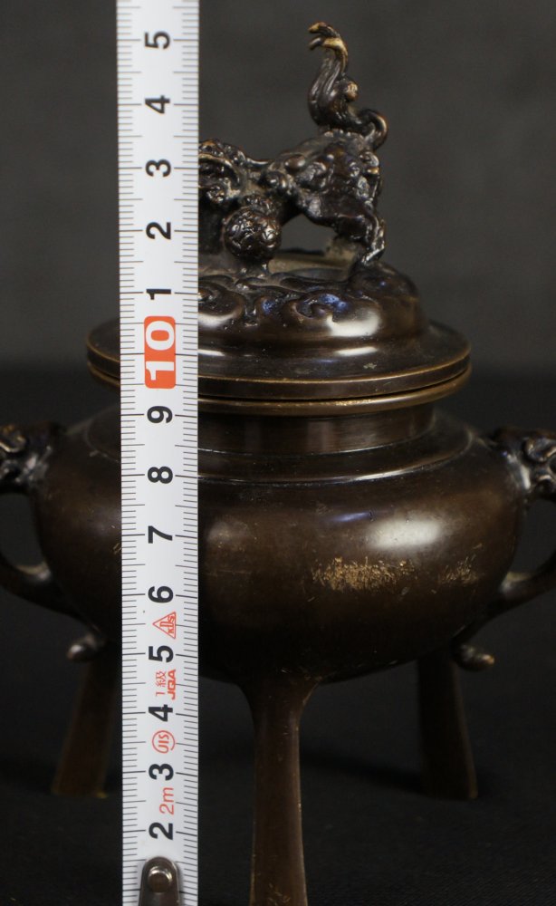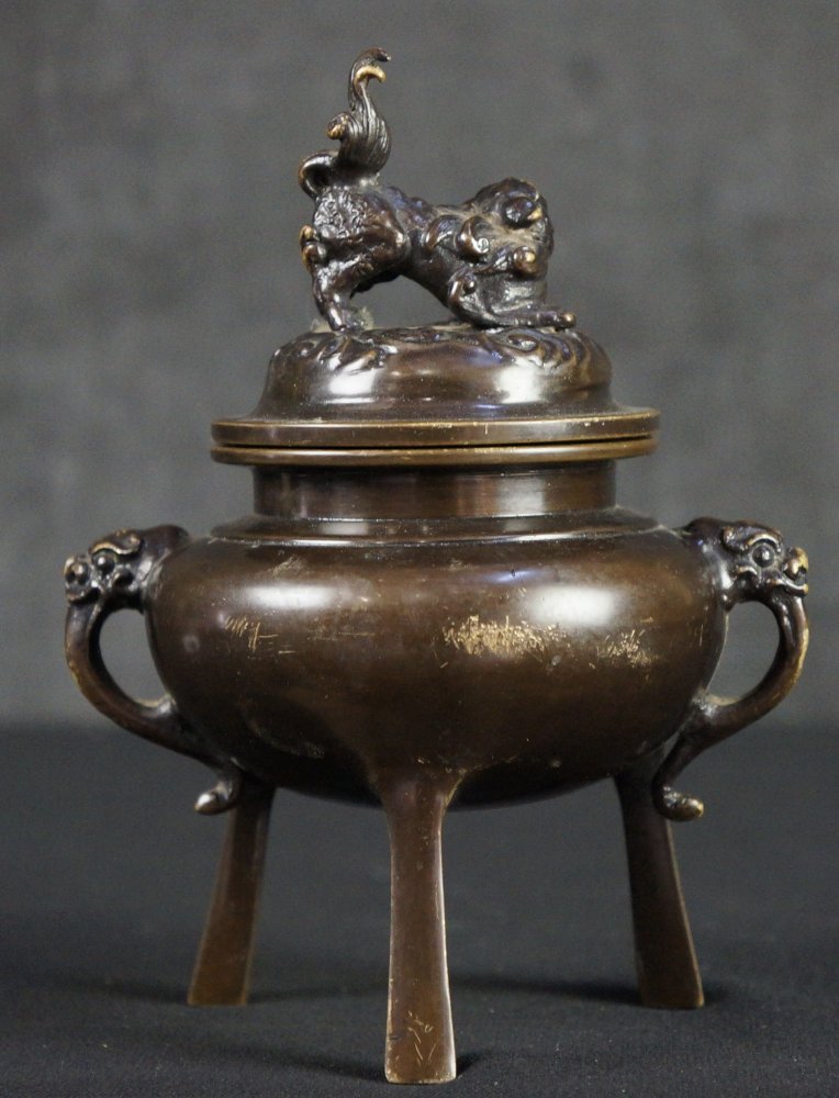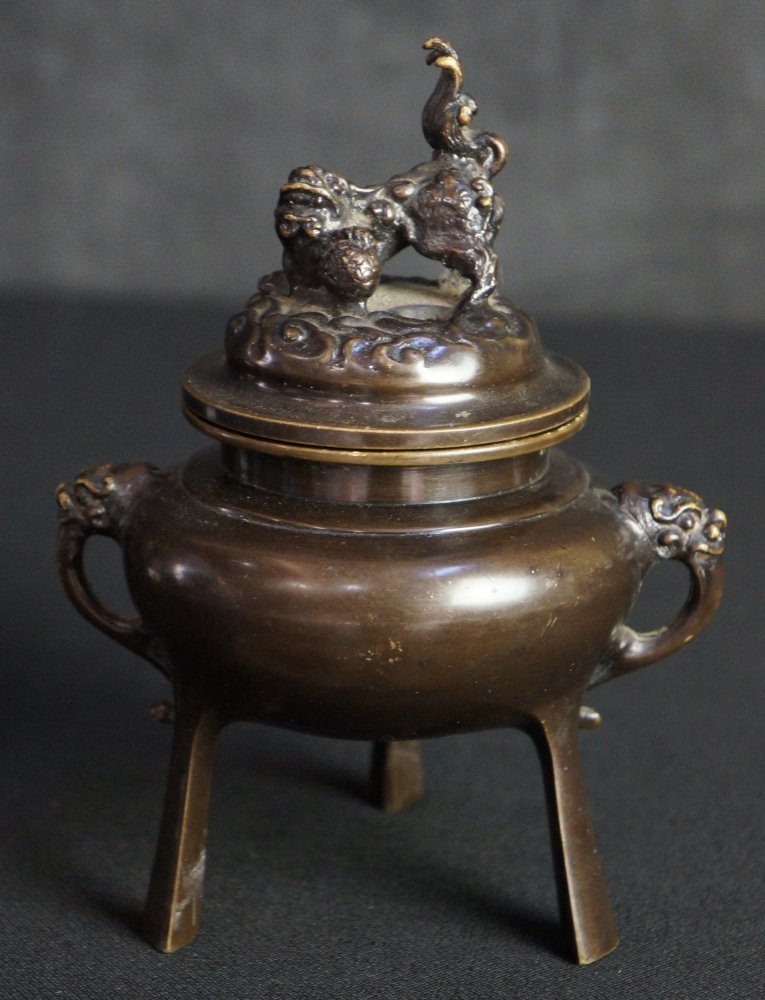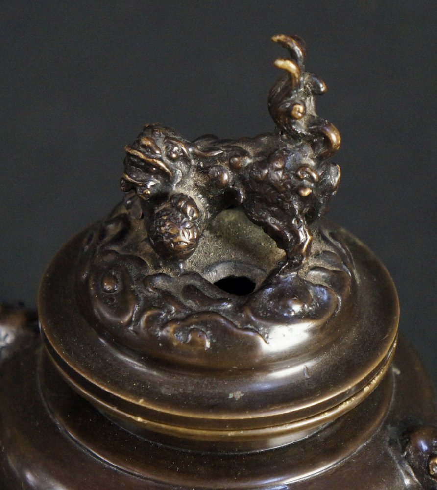 Japanese incense burner Koro solid bronze lost wax technique, decorated with Shishi lion/dog.  Very nice craft, some wear from long usage and time, immediately usable.