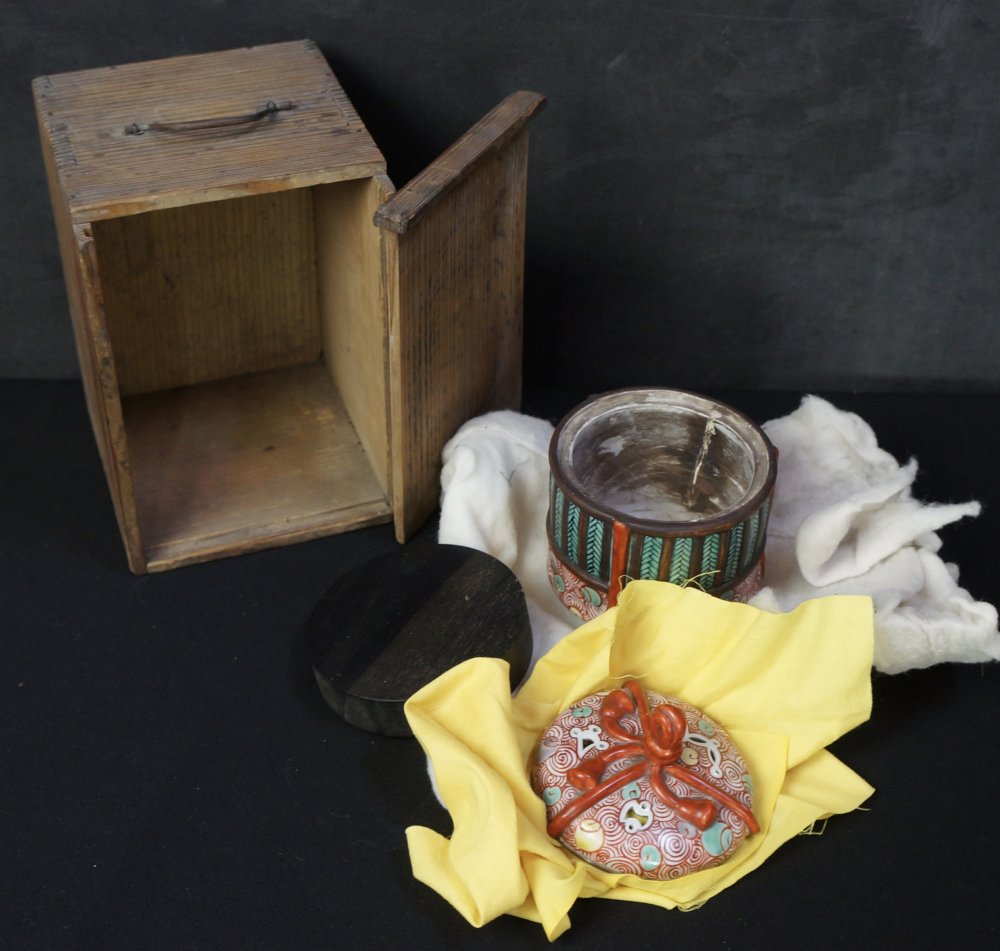 Antique Japanese Kutani Koro censer, modeled and decorated as a Takarabako box with red like ribbon and Tama fantasy. Wood kiln clay expantion with potters restoration with enamel making shape slightly elliptical. Very nice shape well preserved with its original protective wood box. Kutani wood kiln art, light wear marks from usage, no chippings no recent fractures. Immediately usable.