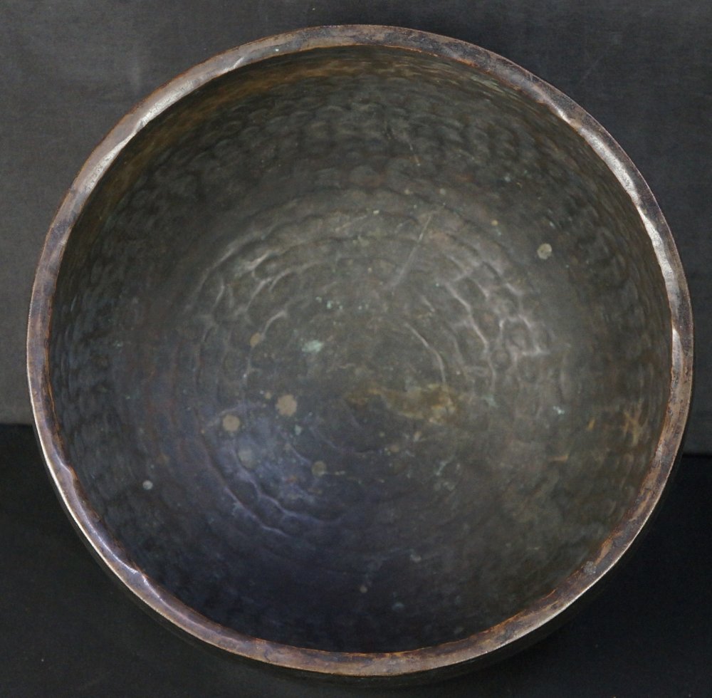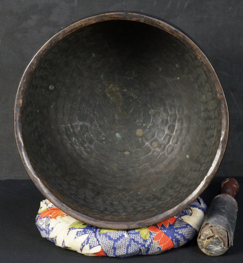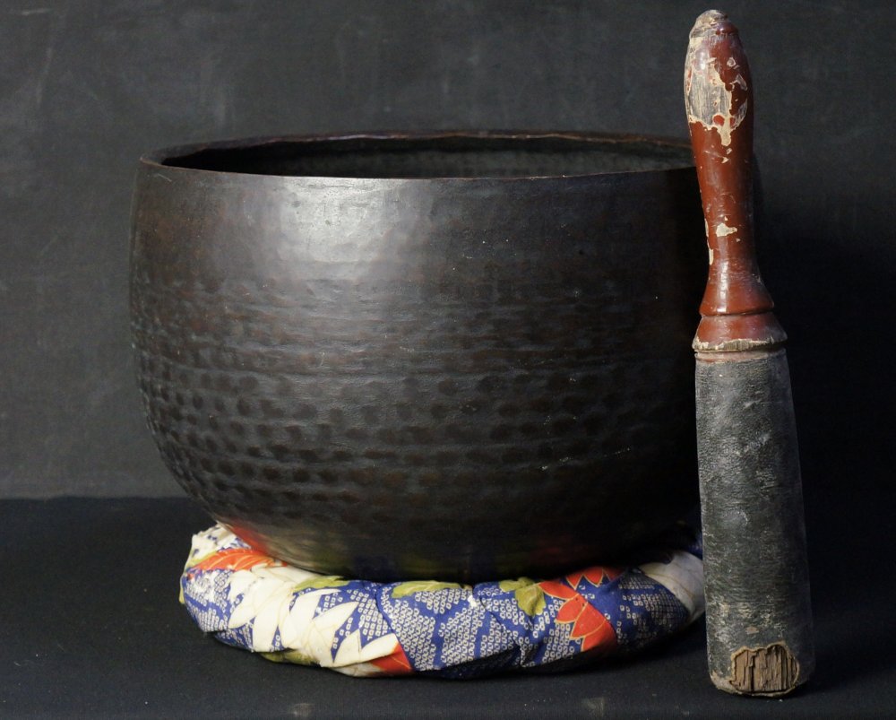 Antique Japanese bronze bell for Buddhist Zen temple, deep long sound chanting bell. Nice patina and craft, engraved dated by top rim May 1781. Good conditions, some wear from long use and time, found with an old silk Zabuton and a worn Bachi hitter, very nice sound and vibrations. Please request recording for sound. Historical temple chanting bell, complete as in photos.