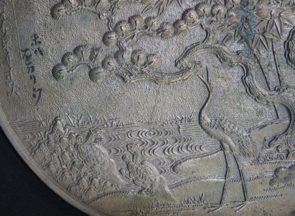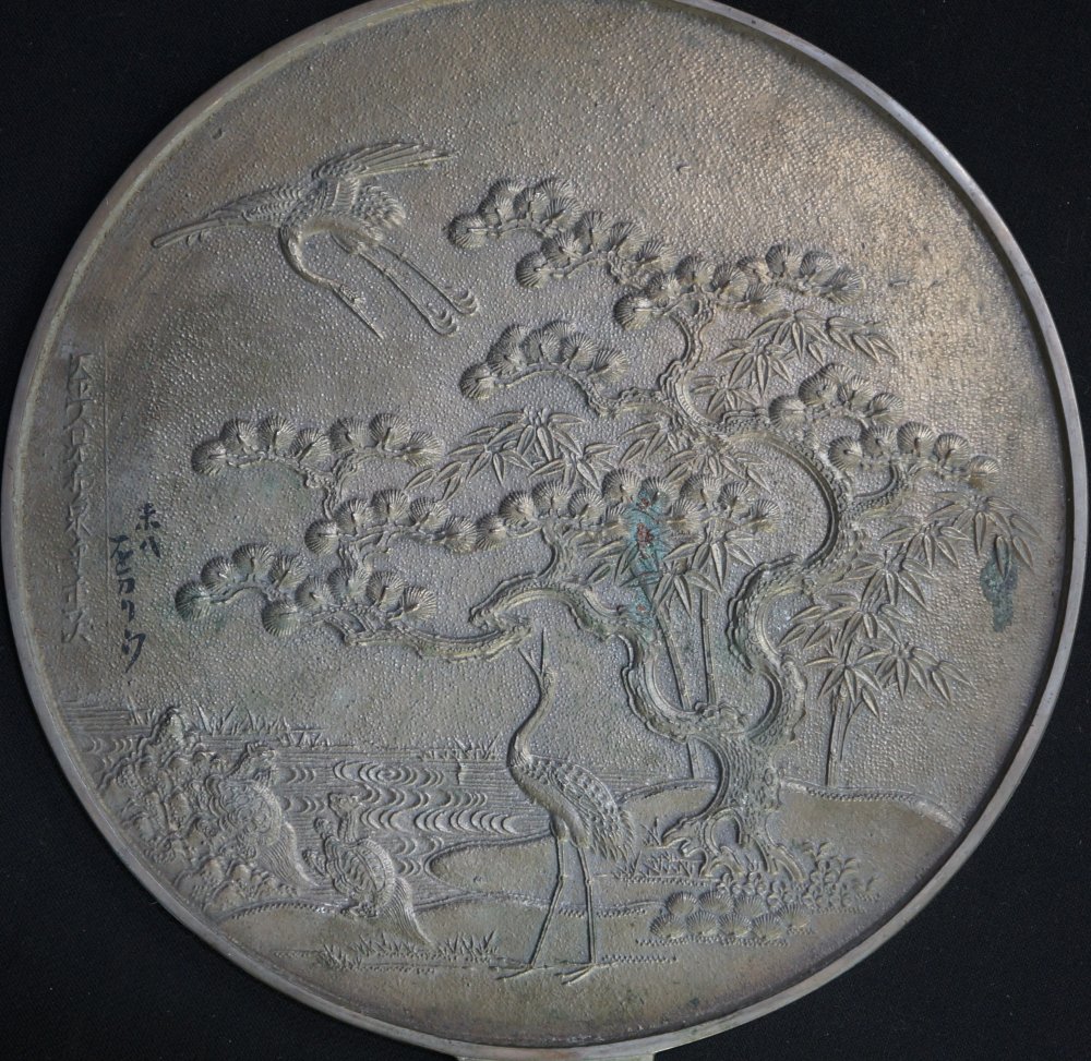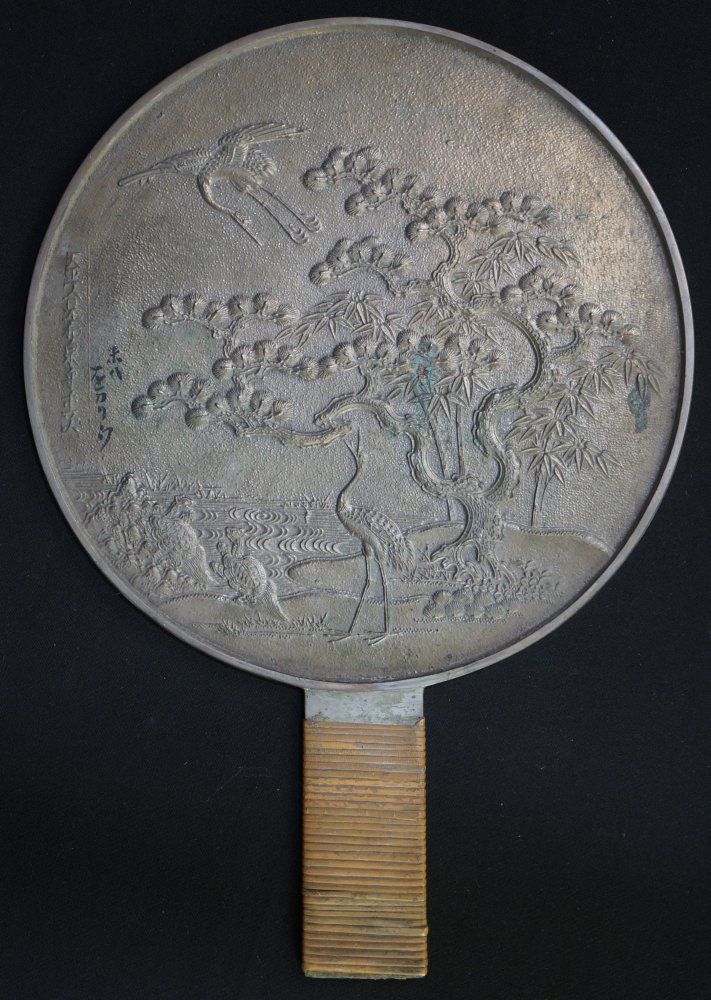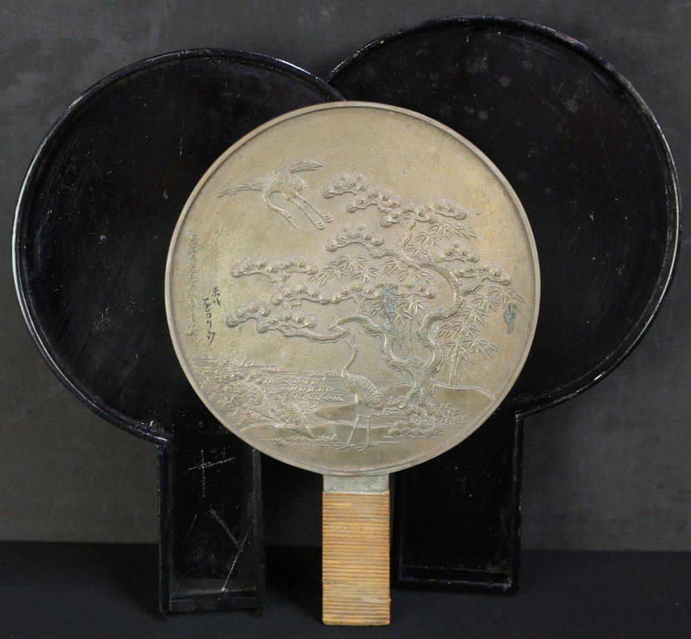 Nice antique Japanese bronze mirror with lacquered wood box, decorated auspicious symbols: Tsuru, bamboo, Matsu tree. Good conditions, some wear marks from time, especially on lacquered wood case. Reflecting side still partly reflecting. Nice historical item immediately usable.