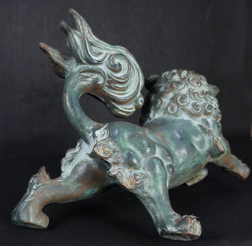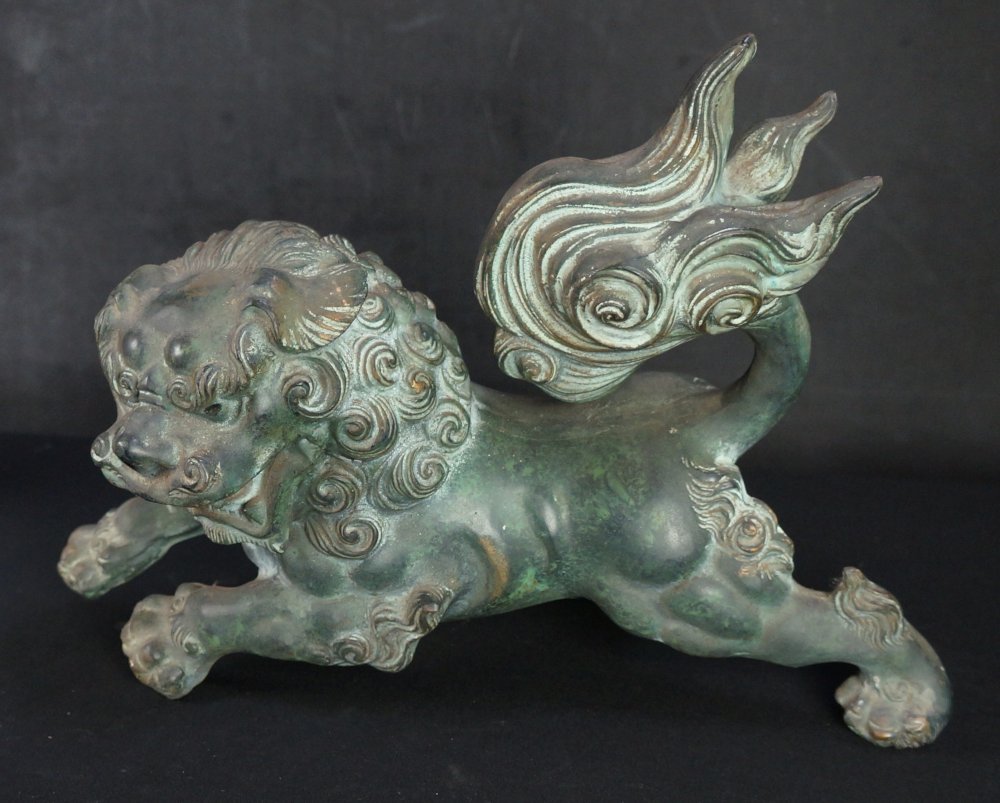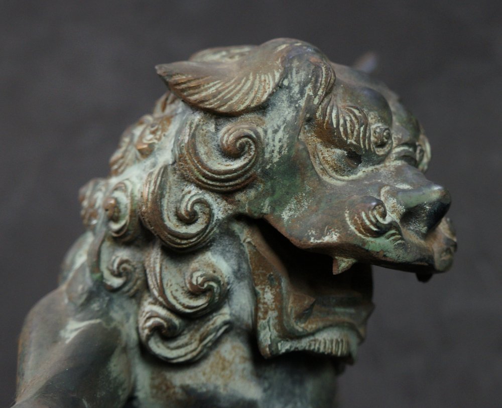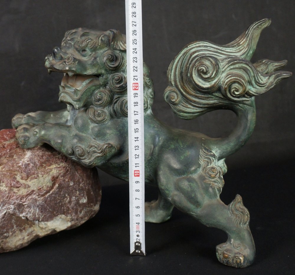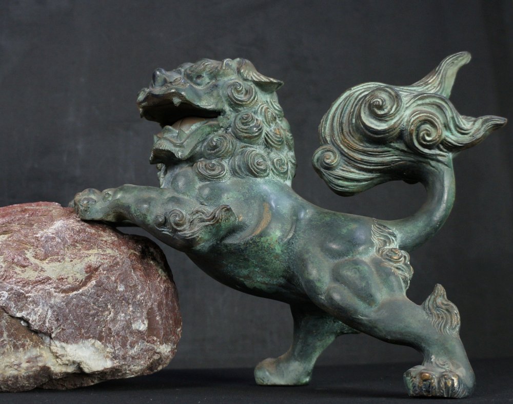 Japanese garden Shishi lion-dog sculpture (stone not included), lost wax technique craft, nice patina. Made to need support for standing like stone or tree trunk, well preserved. Japanese garden sculpture.