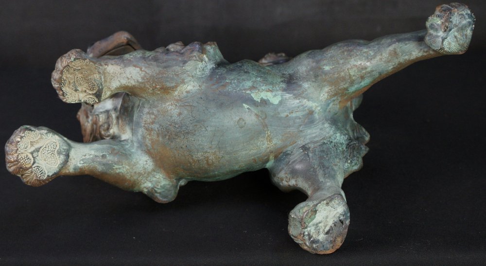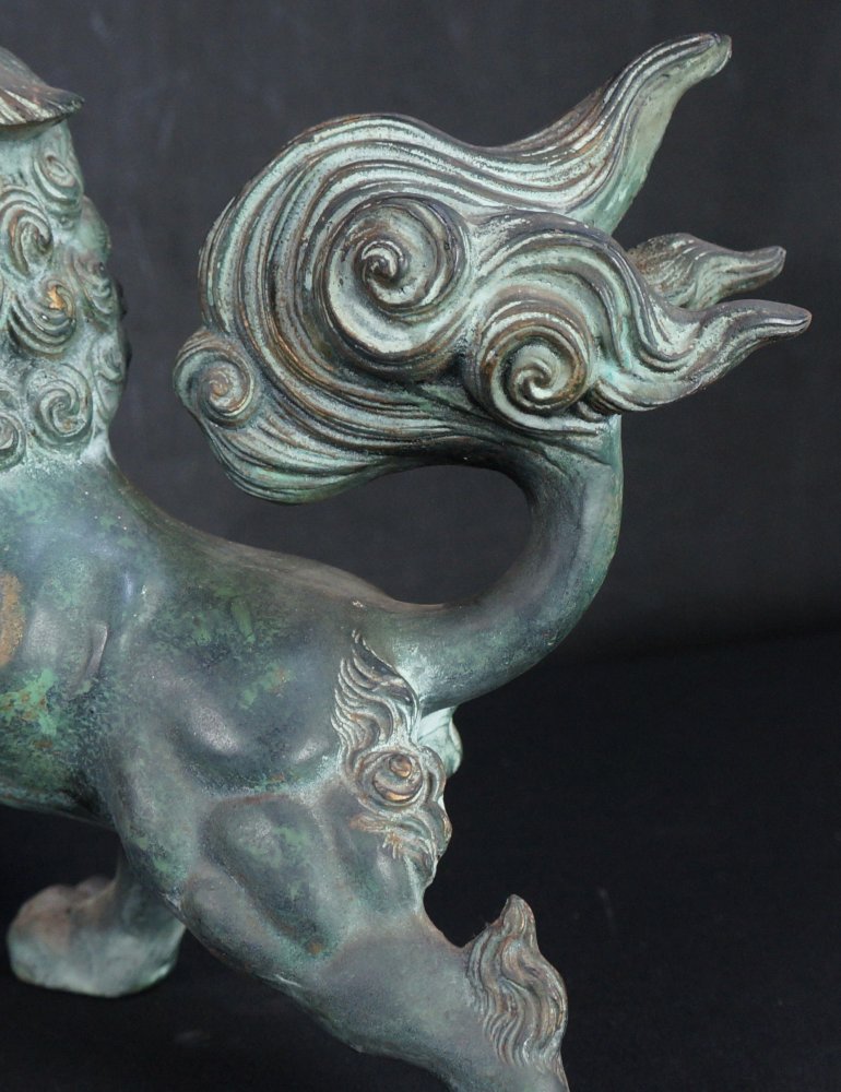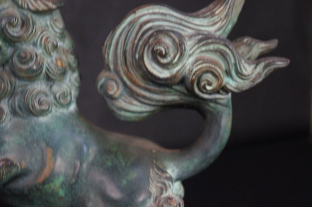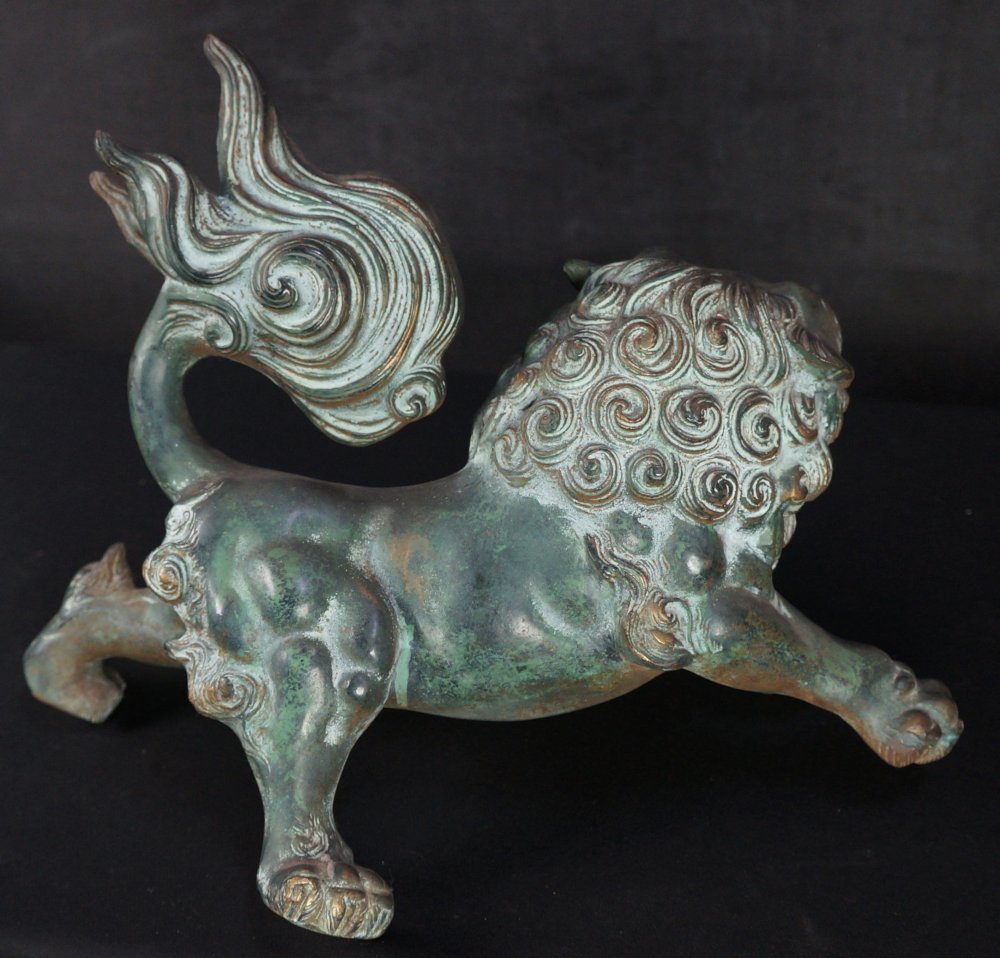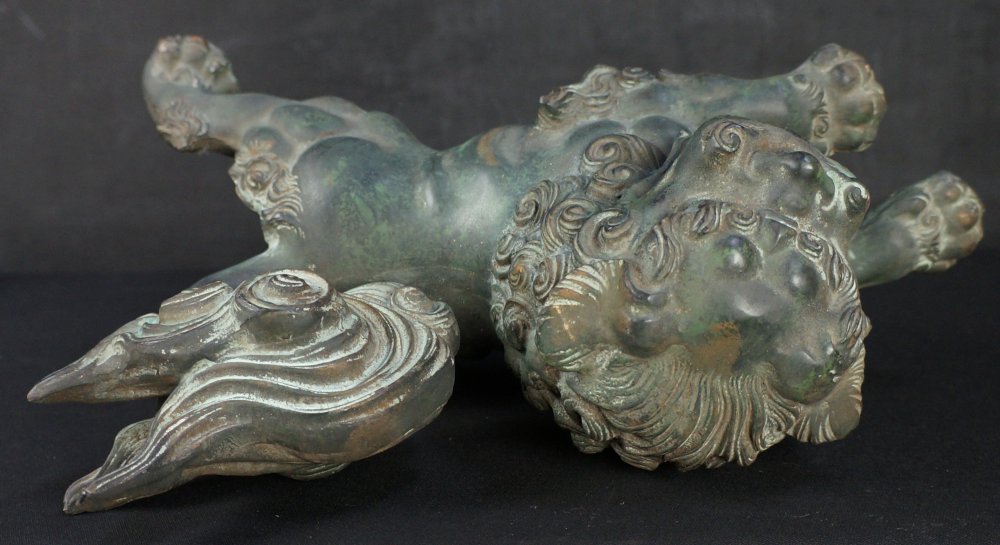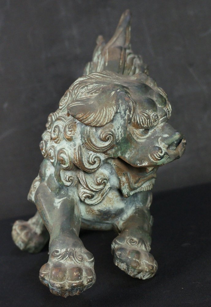 Japanese garden Shishi lion-dog sculpture (stone not included), lost wax technique craft, nice patina. Made to need support for standing like stone or tree trunk, well preserved. Japanese garden sculpture.