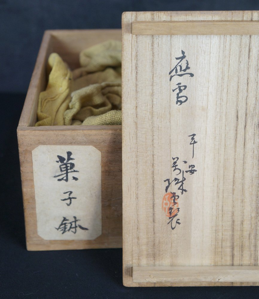 Japanese hand made glass bowl, hand craft well preserved in good conditions with its protective wood box. Immediately usable, small imperfections and air bubbles from hand manufacture, no wear from usage, immediately usable, no fractures.