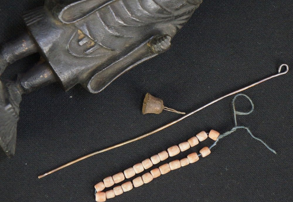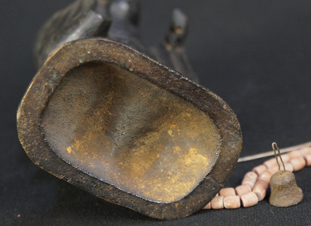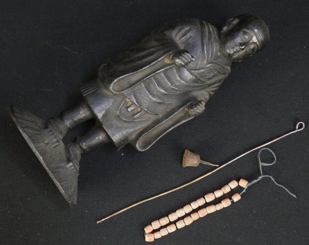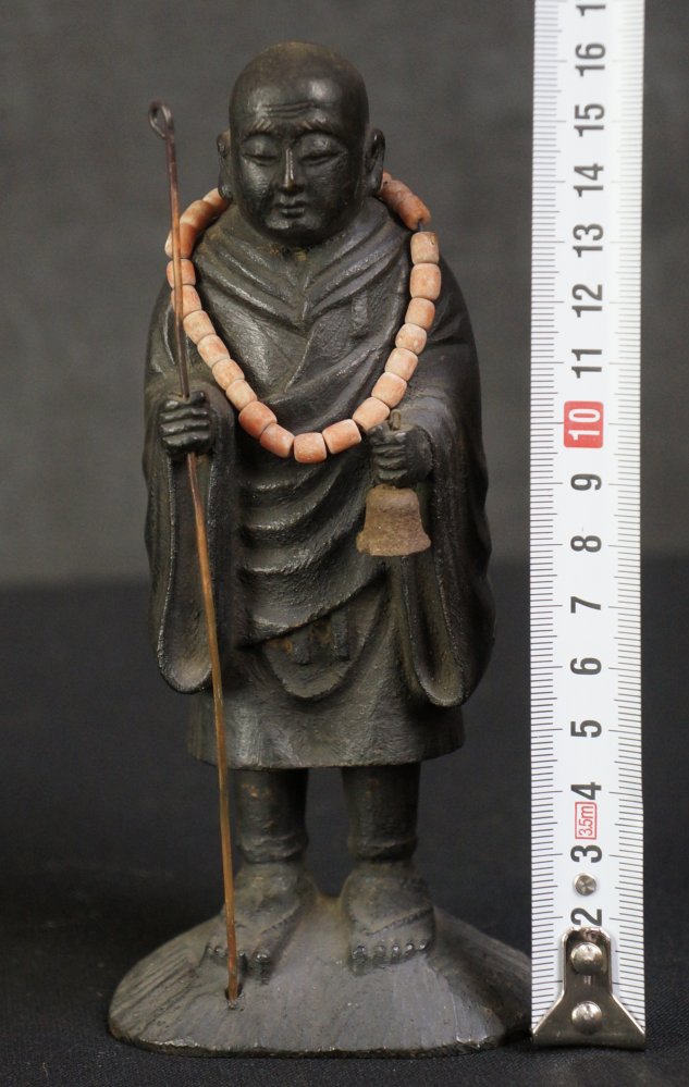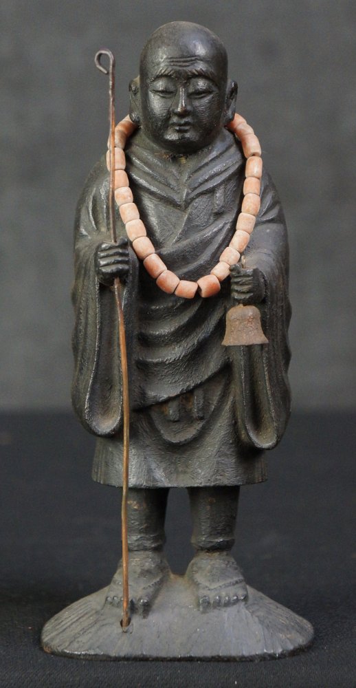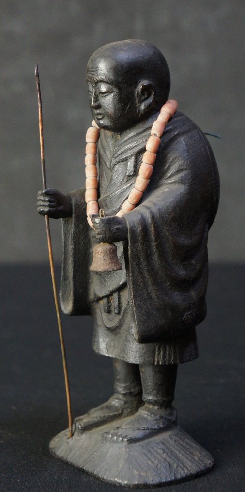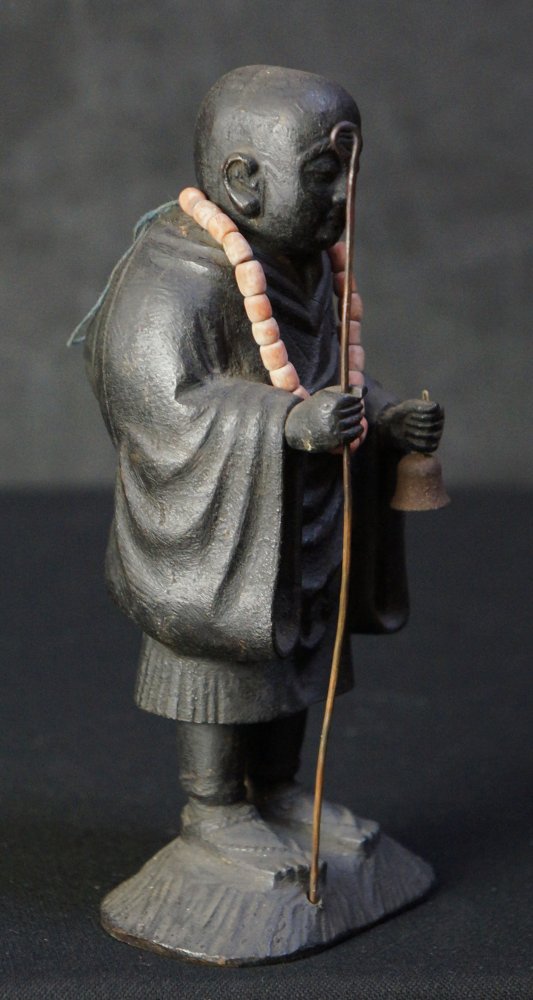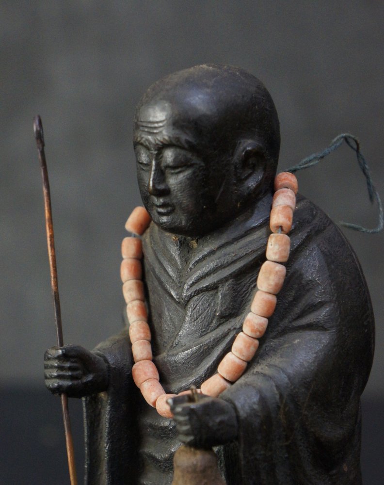 Antique Japanese bronze Buddhist itinerant chanting monk, full bronze craft, found with coral beads and iton miniature bell, nice patina, inscription on base Nobumasakai. Itinarant chanting monk figurine.
