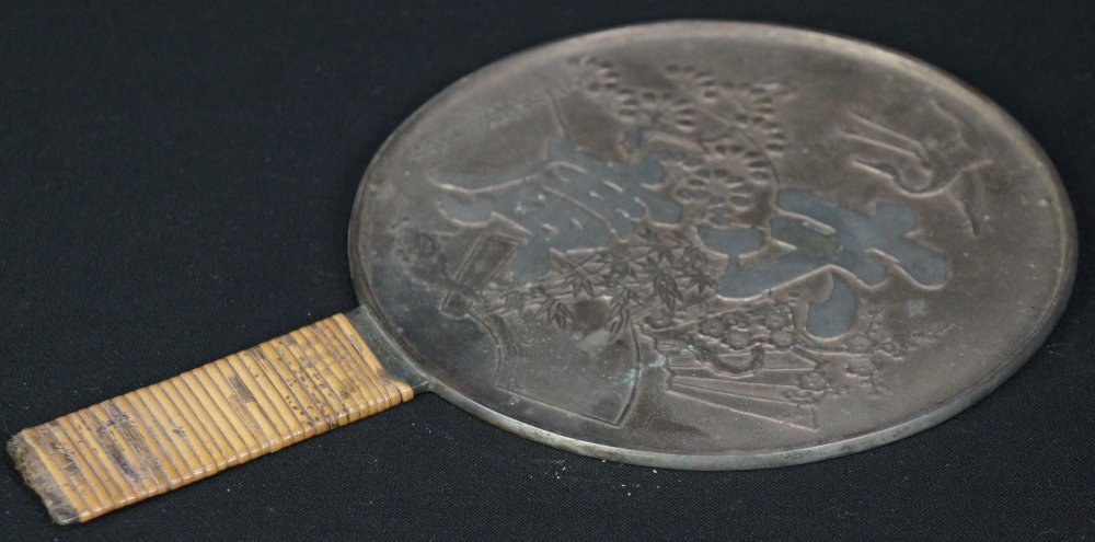 Nice antique Japanese mirror decorated with Tsuru birds and Natsu trees, sakura and bamboo. Nice patina medium good  conditions, wear from time and long usage, partially reflecting. Nice historical item.