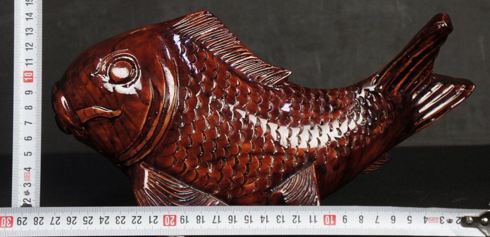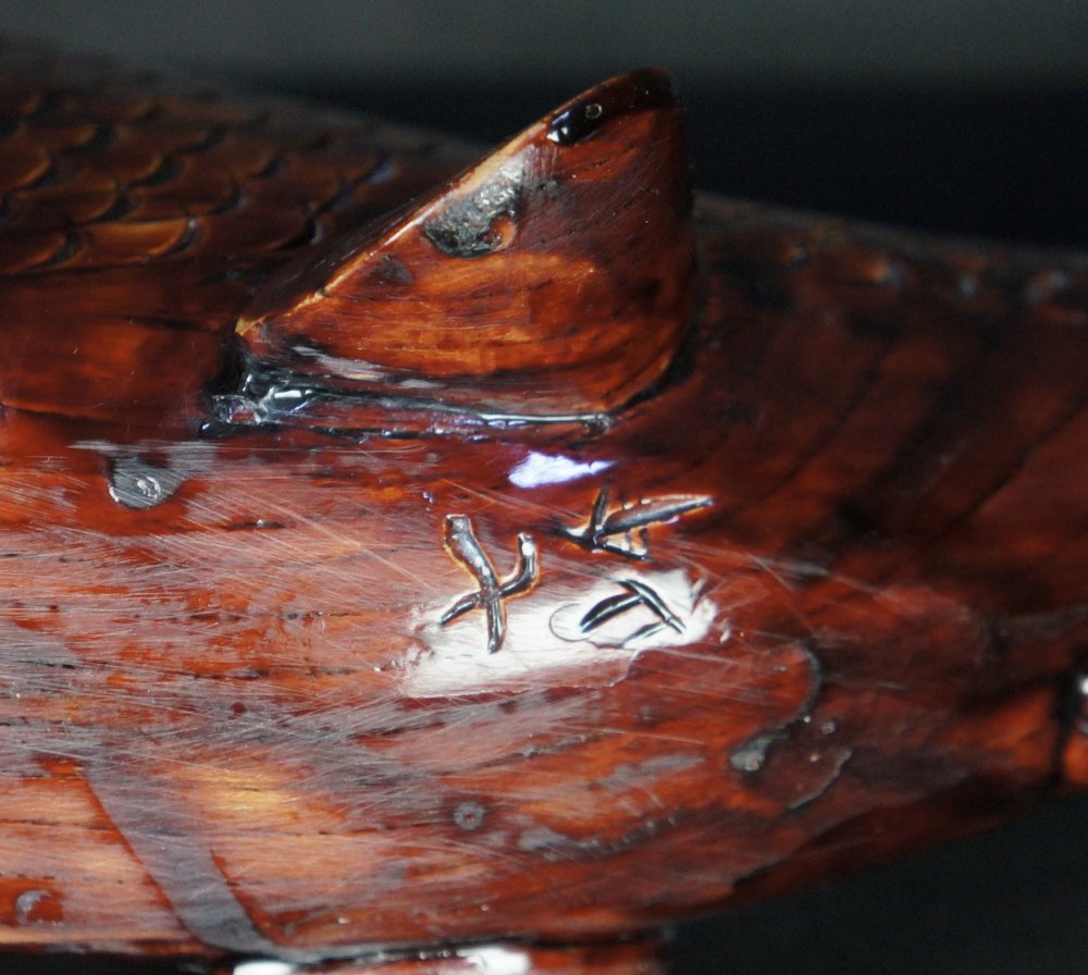 Vintage Japanese Koi carp wood carving, good conditions, carved from single wood block. Light wear from usage used and time. Makers name on bottom Shichiho (七峰). Nice character and  patina with natural wood aging markings, iron ring.