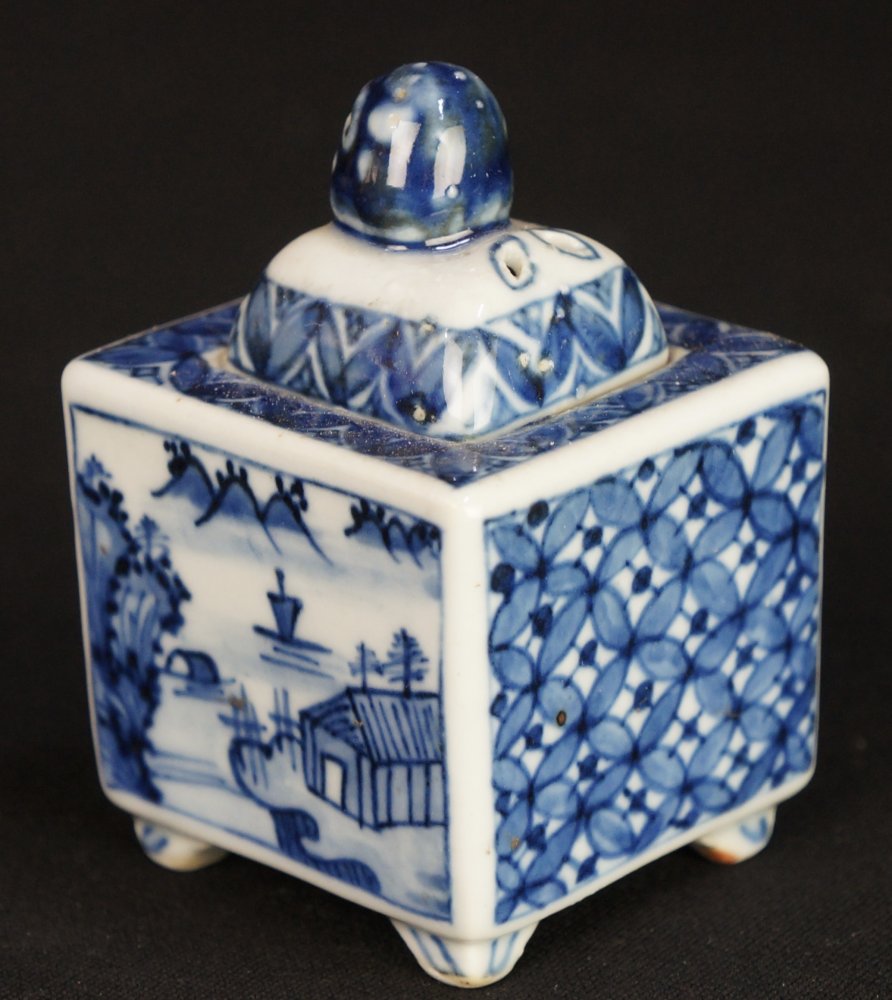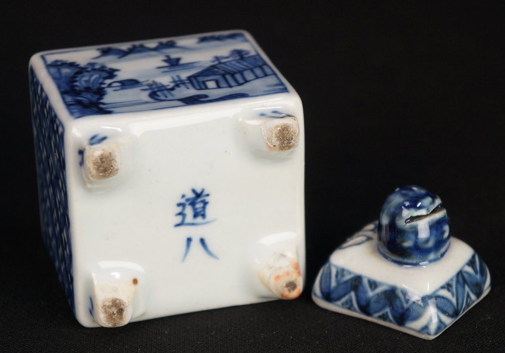 Nice Japanese incense burner Koro, decorated with landscape and geometrical motifs. Signed on the bottom by Michiha (道ハ), well preserved, good conditions, no fractures, no chippings, light wear marks from usage. Immediately usable.