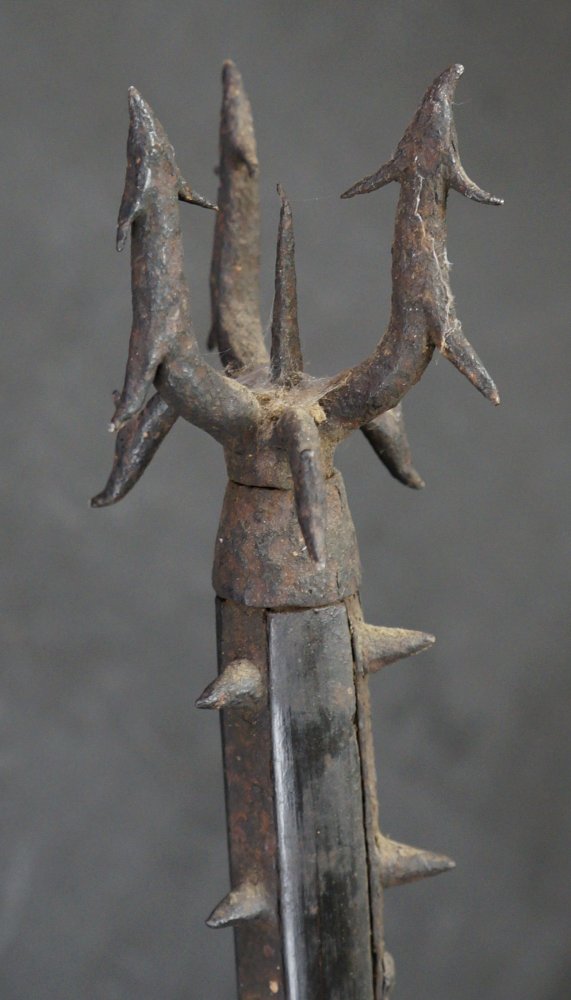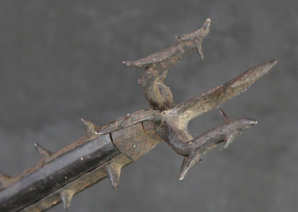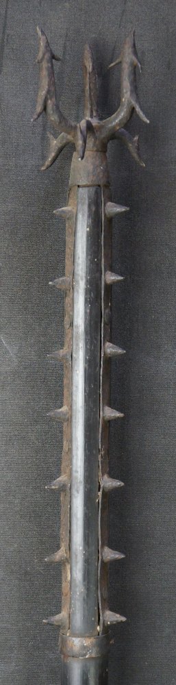 Antique Japanese spear hook Mojiri, medium conditions wear marks from time and usage visible, oxidation on all iron parts, wood shaft in good conditions slightly bent from aging. To be handled with care dangerous sharp spikes, interesting historical tool.