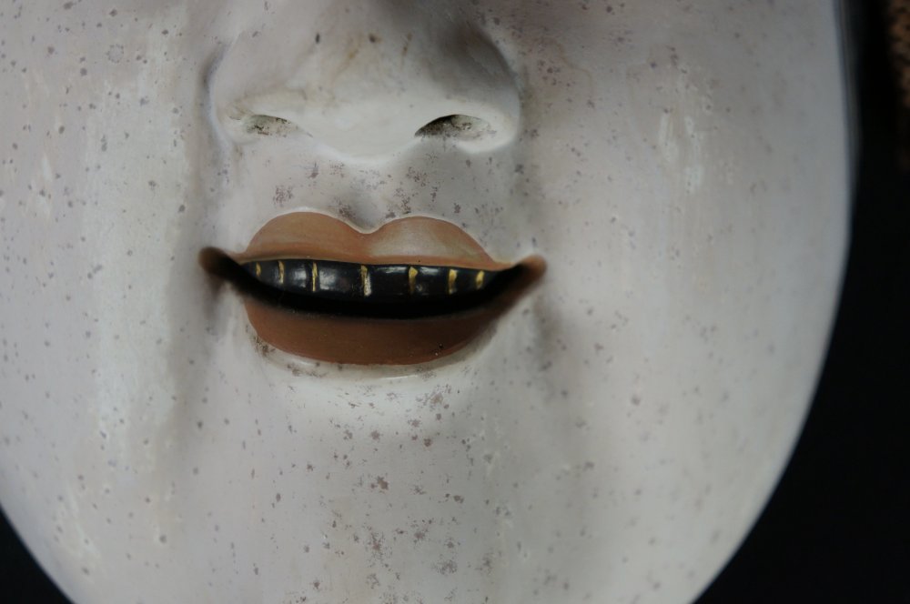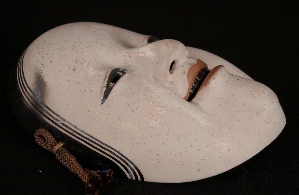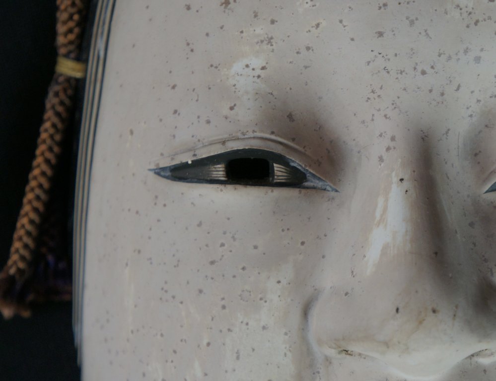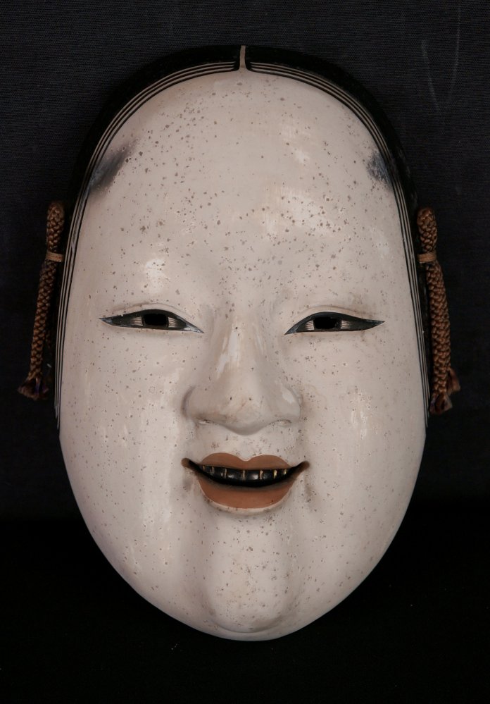 Vintage Komote Noh mask hand made ceramic painted surface, some wear on surface from long handling and exposure. Some wear from usage and time, no fractures. Japan Noh theater craft.