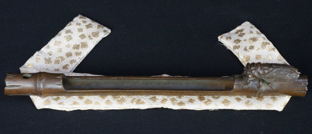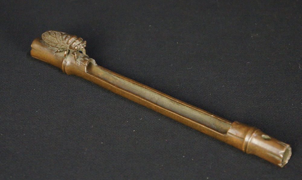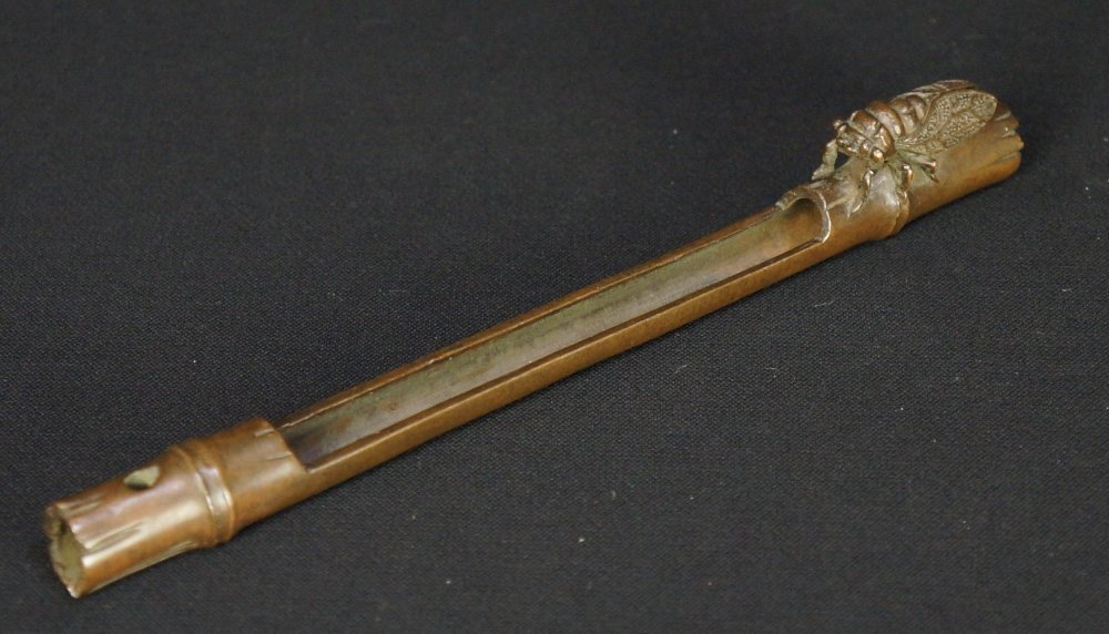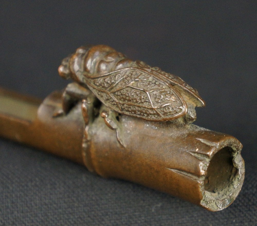 Fine Japanese bronze Koro incense stick holder, bamboo shape with Semi cicada motif, fine bronze craft, makers seam visible on bottom, maker Amemia Sou (雨宮宗). Very good conditions, nice patina, light wear from usage, lost wax technique, immediately usable with protective wood box.